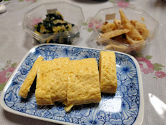 さて、国分寺マルイで始まった「京都・滋賀フェア」で買ってきたおばんざいです。左上が小松菜、その右が筍、下が出汁巻き卵焼きです。