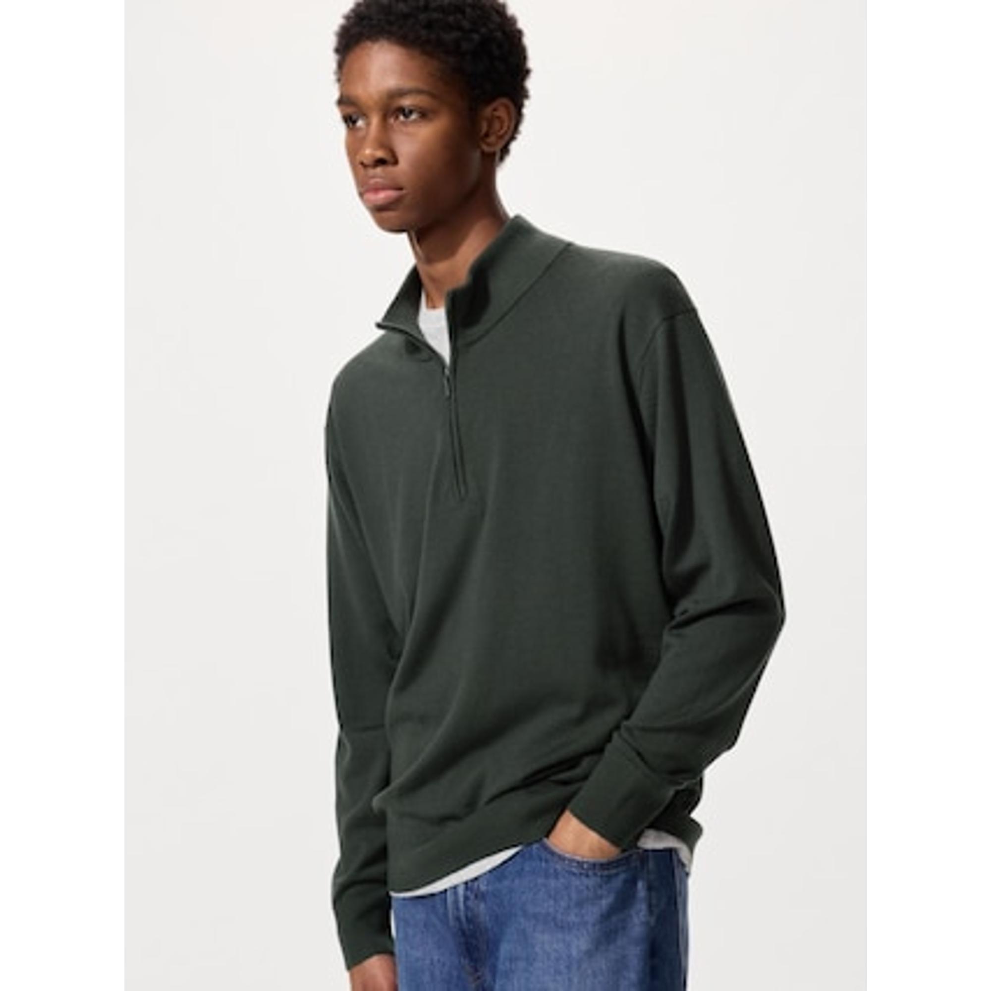 メリノハーフジップセーター(2,990円): 極細メリノウール100%の美しい光沢感が特徴。XSサイズ中心の在庫ですが、女性にもおすすめです。