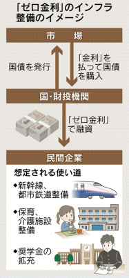 政府・与党はインフラの整備に使う資金をほぼゼロの金利で民間企業に融資する仕組みを検討する。日銀のマイナス金利政策で発行コストが大幅に低下した国債を増発し、日本政策投資銀行など政府系の機関を通じて最大で3兆円を貸し出す。新幹線の建設といった大規模な事業を進めやすくし、もたつく景気を下支えする。