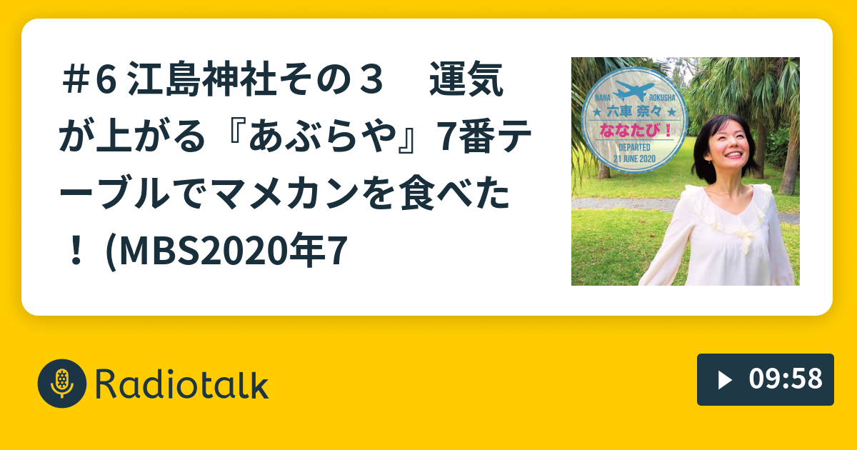 MBSラジオ『六車奈々 ななたび!』#6アップ!MBSラジオ『六車奈々 ななたび!』は、明日24:30-24:40放送です。そしてradiotalkには、アップされています。https://radiotalk.jp/talk/333168#6 江島神社その3 運気が上がる『あぶらや』7番テーブルでマメカンを食べた! (MBS2020年7月26日OA分)#ラジオロケ #MBSラジオ #ななたび #深夜ラジオ #ご利益 #旅 #六車奈々 #メッセージ募集 #江島神社 #江ノ電 #江ノ島 #美人のご利益 #旅グルメ #スイーツ #パワースポット #運気アップradiotalk.jpぜひ聴いてくださいねー!クリップ(番組登録)も、よろしくお願い致します。 #ラジオロケ #MBSラジオ #ななたび #深夜ラジオ #ご利益 #旅 #六車奈々 #メッセージ募集 #江島神社 #江ノ電 #江ノ島 #美人のご利益 #旅グルメ #スイーツ #パワースポット #運気アップ 奈々