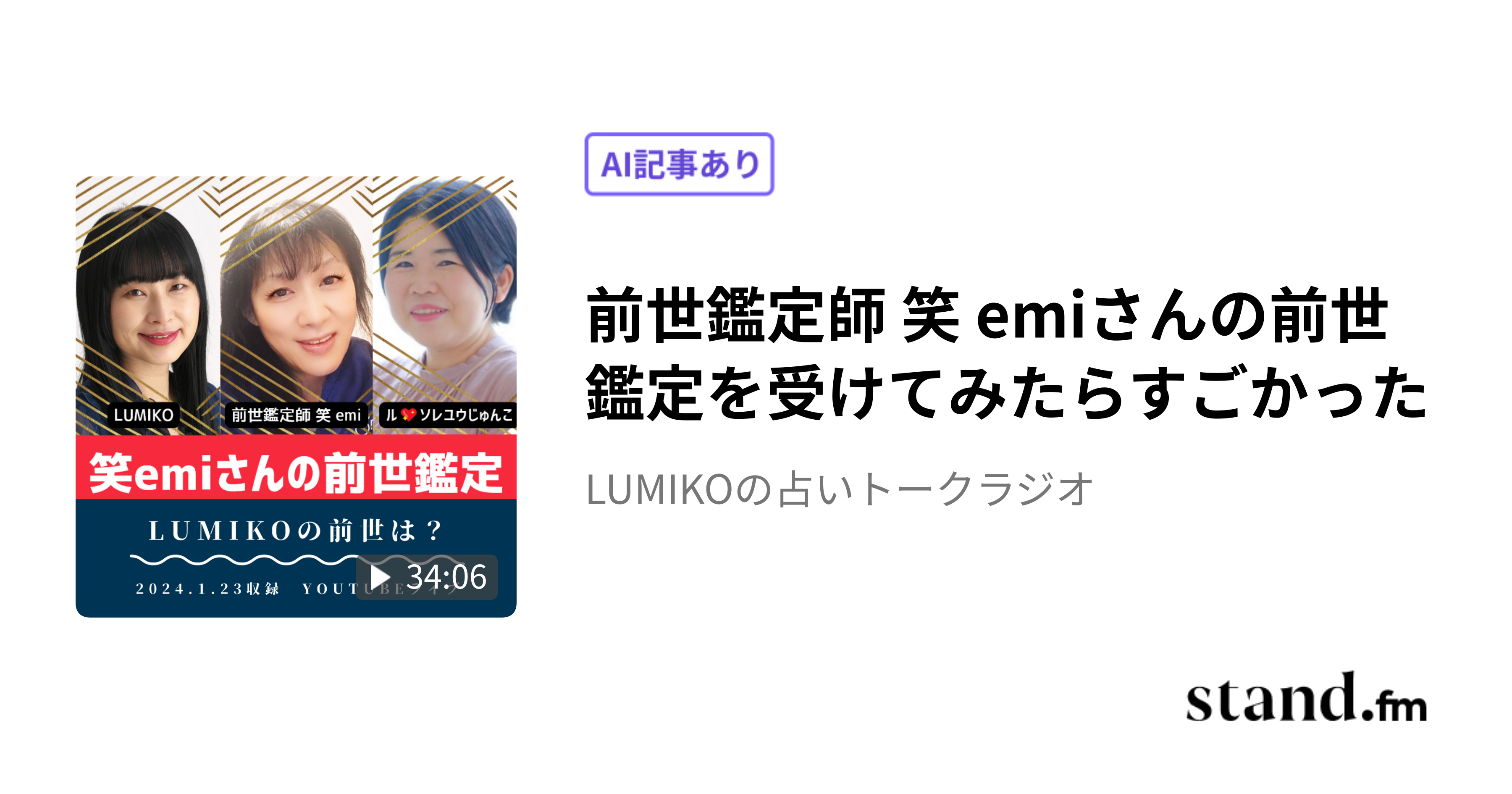 スタンドFMにもアップしました。 前世鑑定師 笑 emiさんの前世鑑定を受けてみたらすごかった - LUMIKOの占いトークラジオ | stand.fm2024.1.23収録 画家のル💖ソレユウじゅんこさんからのご紹介で、えみさんの前世鑑定を受けさせて頂きました。 前世鑑定師笑 emiさん emiさんのインスタグラムより↓ チャクラを解放して身体と心と運気を元気にするインストラクターをさせて頂いてます。エアロビクスインストラクター歴25年、(託児所付き有り)チャクラバ…stand.fm先日の対談の音声を、スタンドFMにもアップしました。今回は第一弾です。次回、第二弾もお楽しみに。LUMIKO