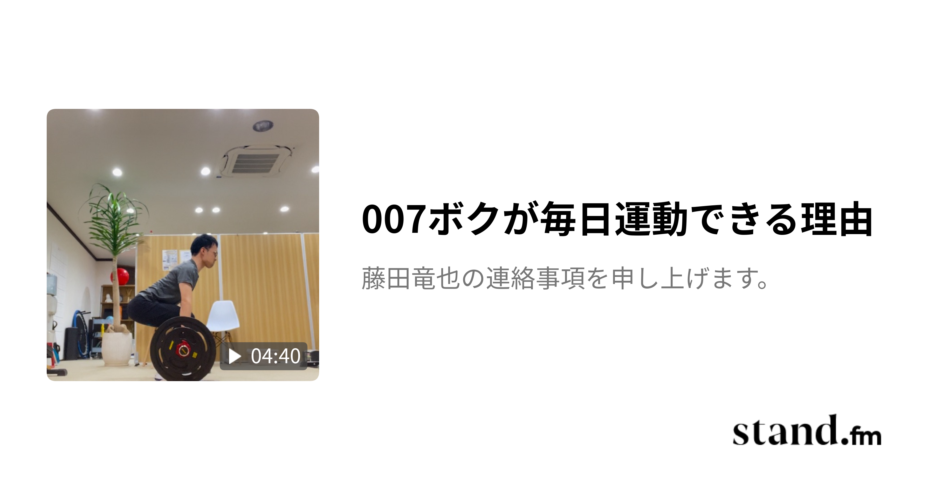 007ボクが毎日運動できる理由 - 藤田竜也の連絡事項を申し上げます。 | stand.fm広島県廿日市市のパーソナルトレーニングジムroot.(ルート)代表の藤田竜也です。毎日ラジオはじめました。 新規会員さん募集中! https://root-conditioning.comstand.fm