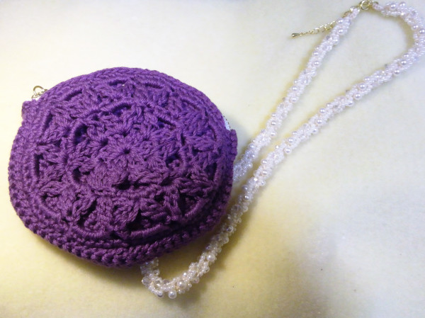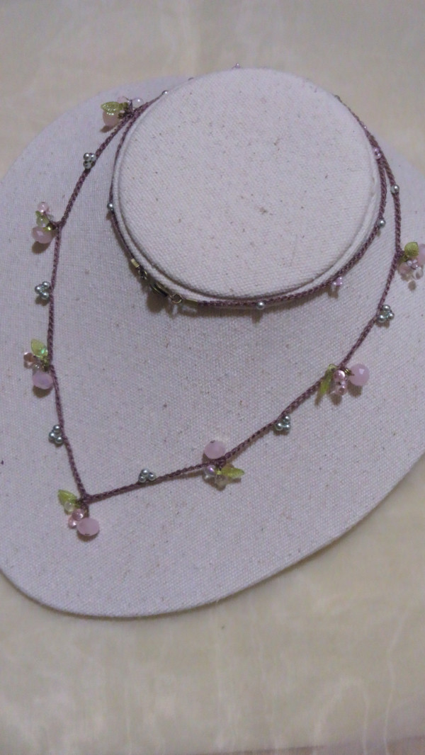 淡いピンクのビーズが輝くかぎ針編みのネックレスです。