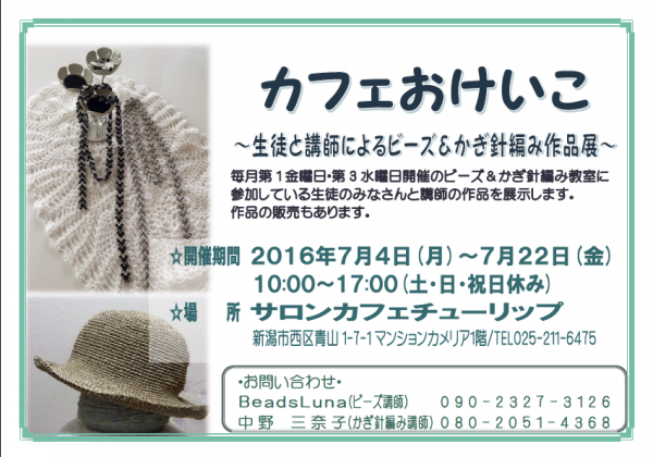 もちろん、「私もこれ作りたいな」と思われましたら、ぜひ、カフェおけいこ~ビーズ&かぎ針編み~にご参加ください。
