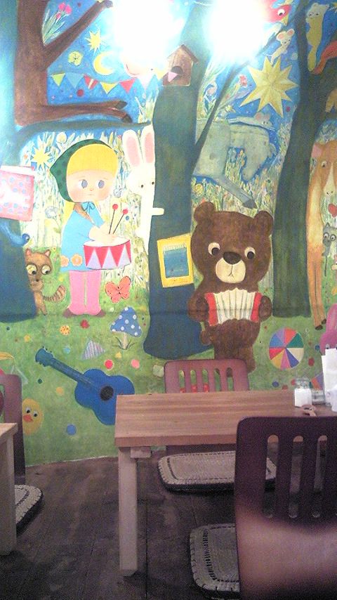 壁一面絵本みたいな絵が描かれた、とってもメルヘンなカフェでした![]()