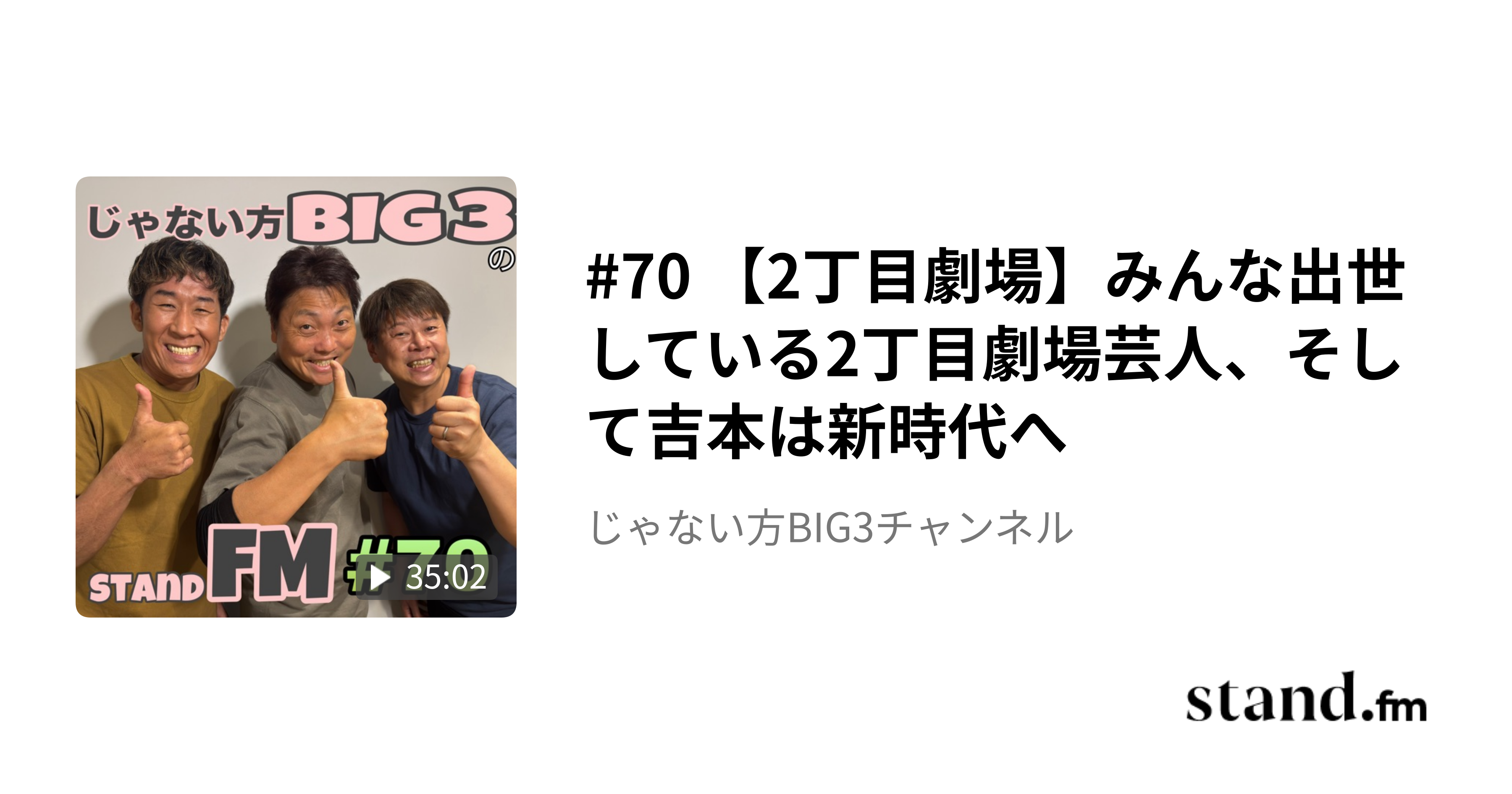 #70 【2丁目劇場】みんな出世している2丁目劇場芸人、そして吉本は新時代へ - じゃない方BIG3チャンネル | stand.fm#じゃない方BIG3 #サバンナ八木 #野性爆弾ロッシー #ロシオープニング #麒麟田村 #CR2丁目劇場 #2丁目芸人のその後 #劇場の風紀委員システム #たむらけんじ #ストリーク吉本 #スーパーマラドーナ武智 #かまいたち濱家stand.fm