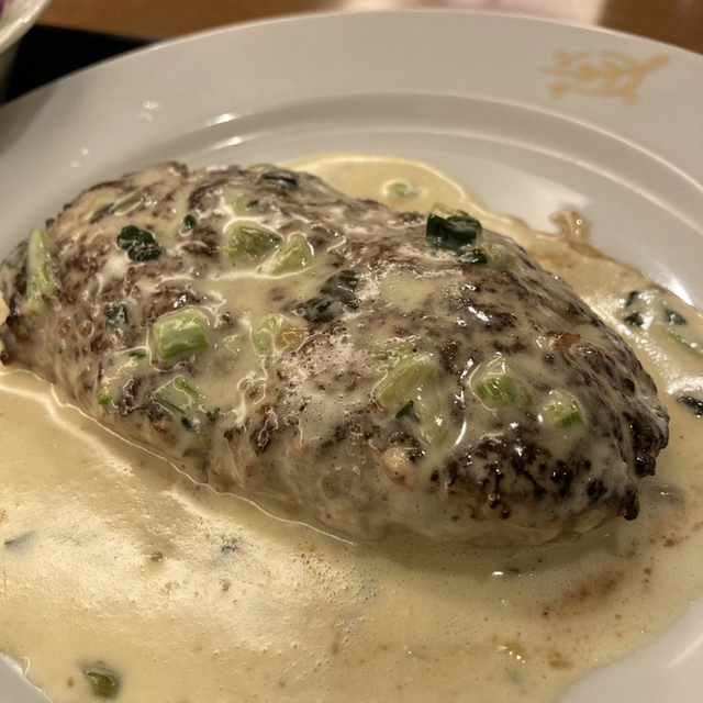 ハンバーグはところどころに肉塊がゴロったら入っており食べごたえ抜群。最近流行りのフワッとハンバーグではなく、昔ながらの厚さのハンバーグであり、生クリームのソースも珍しい。