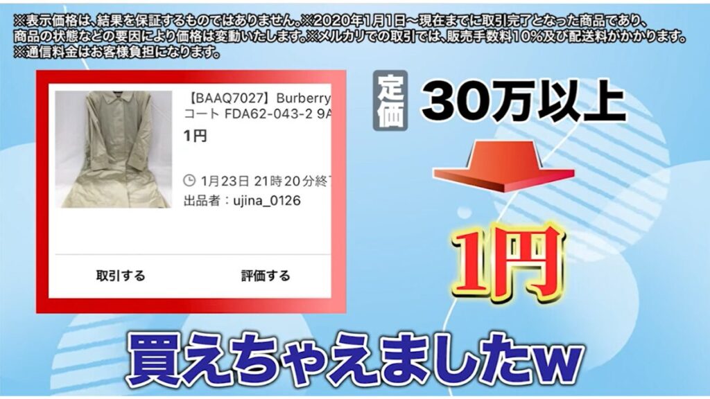 物販ONEのYouTube広告では、「定価30万円以上のBurberry(バーバリー)のコートが1円で購入できた」という事例も紹介されていました。