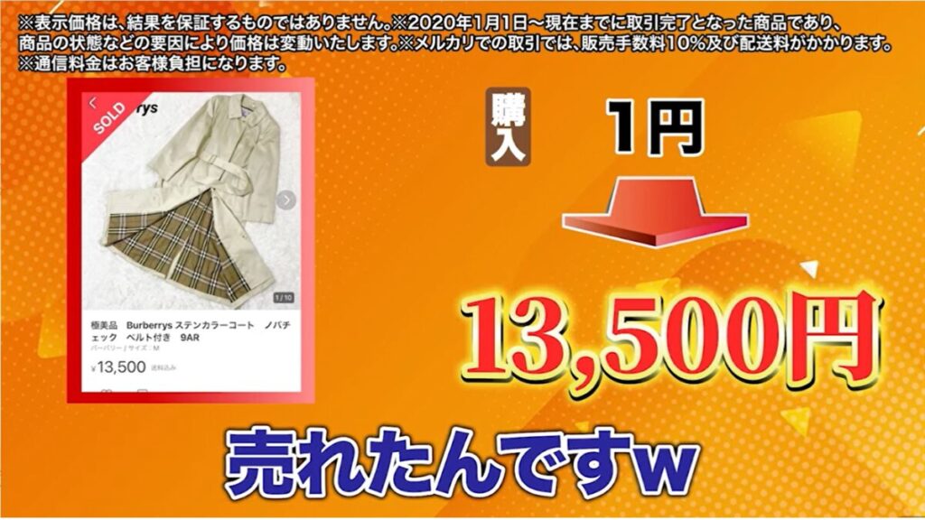 そして、1円で仕入れた商品をメルカリに出品して売れると、仕入れ値がタダ同然なので大きな利益が得られます。