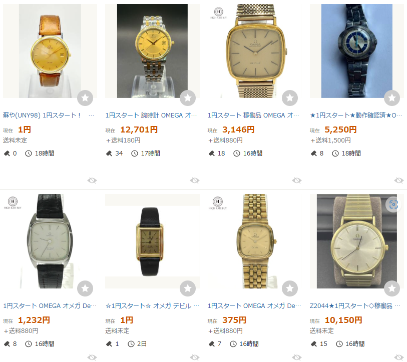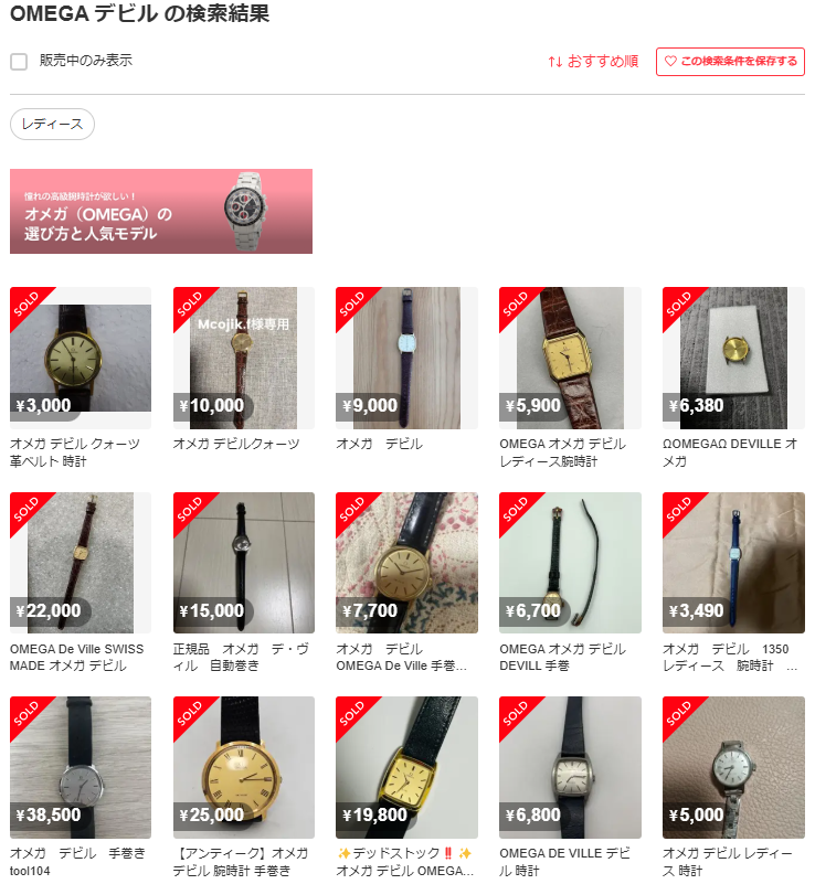 今回ヤフオクで選んだ時計をメルカリで、「OMEGA」「デビル」「売り切れ」で検索したところ、次のような結果でした。