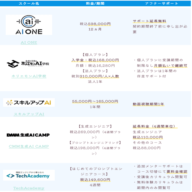 以下の比較表では、受講後のアフターサポートを中心に、AI ONEと他の主要AIスクールの特徴をまとめました。