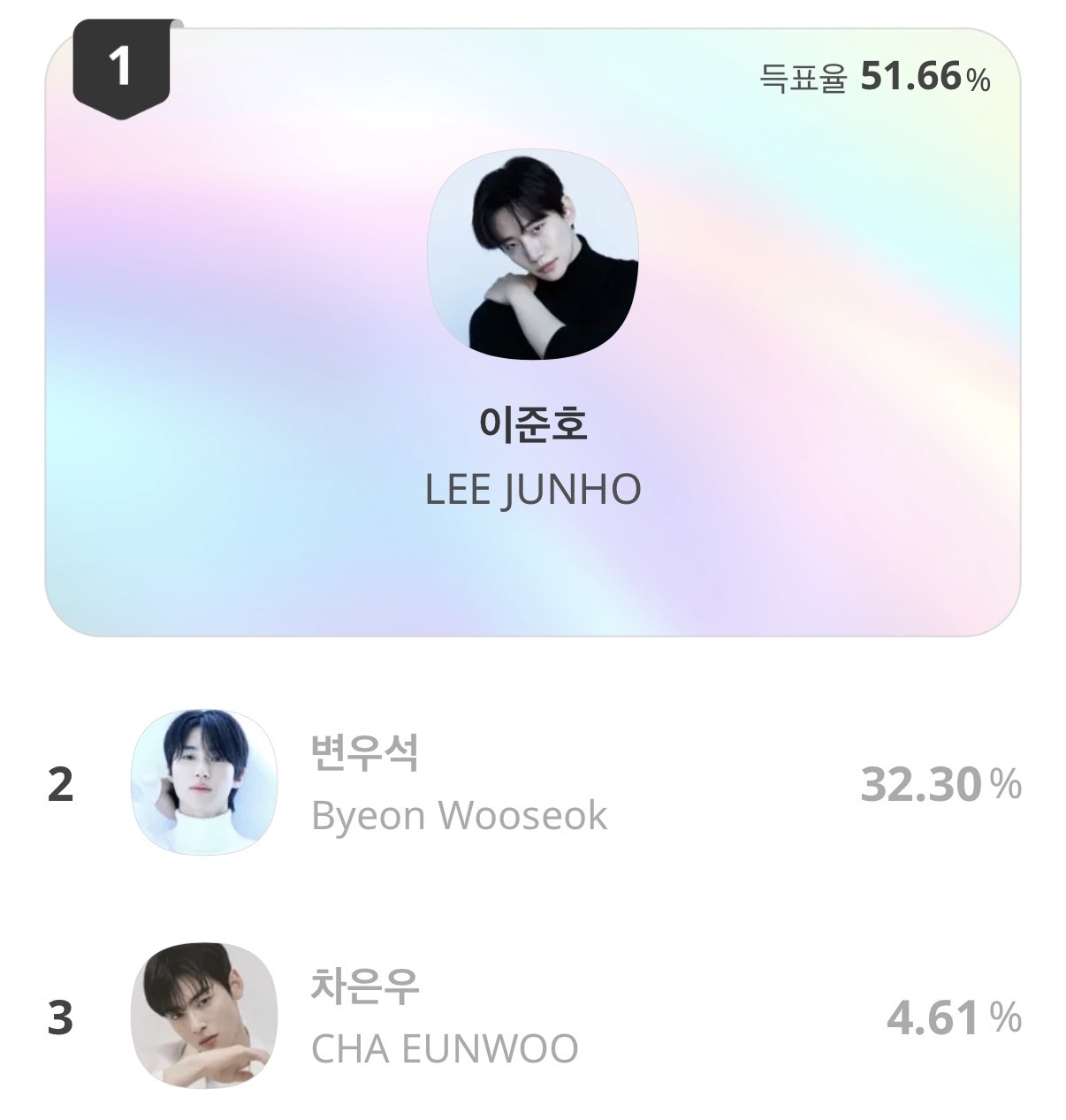 男ソロ1位はイム・ヨンウンが得票率83.43%で占めた。合計1,097,937票を得た。 2位は都兼(6.93%)、3位は都営(2.94%)だ。