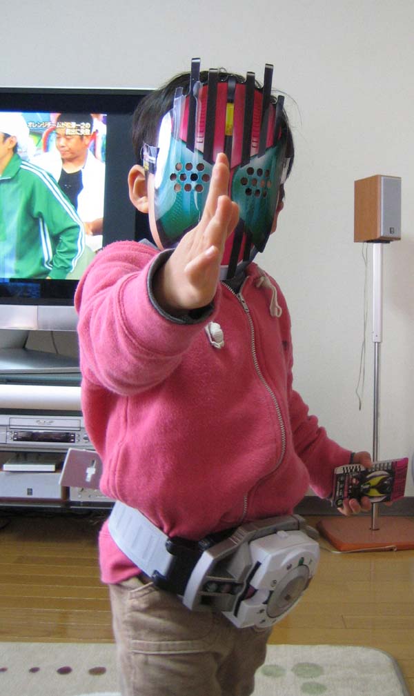先週、旦那さんと2人でゴーオンジャーの映画に行った時も、その「紙製」のベルトとお面着用というものすごいスタイルで出掛け、映画の後もそのスタイルで、おもちゃ売り場なんかをウロウロし、みんなに失笑されたらしい。