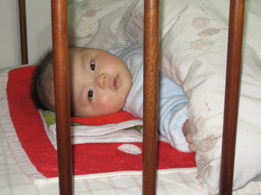 で、ベビーベッドの柵を閉めると、柵越しに、