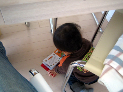 テーブルの下に隠れて読むという、やらしい作戦決行中…。なんとか、和解。これに懲りず遊んでね