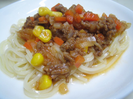 きびめんでミートソースパスタ麺は手づかみでチュルチュルやっていたが、牛肉が苦手らしい