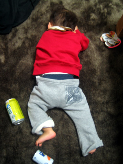 まだ友達同士で遊べるような年ではないが、カーテンで「いないいないばぁ」をして遊んでた。(携帯画像なので、分かりづらいが…)凌ちんが飽きて他の所へ行こうとすると、ヒメカちゃんに頭を殴られた。しっかり者の妻に教育されるダメ夫のようだった。