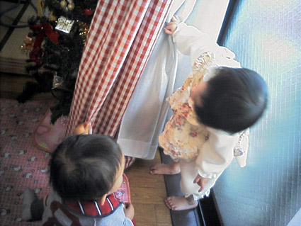 まだ友達同士で遊べるような年ではないが、カーテンで「いないいないばぁ」をして遊んでた。(携帯画像なので、分かりづらいが…)