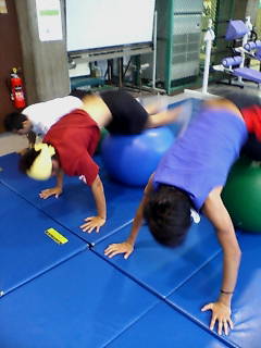 合宿二日目今日は合宿の二日目です。みんなはインターバルなどかなりハードなトレーニングをやってました。ケガ人の別メニュー組は午前中バイク30分×4、午後はインナーマッスルを中心にチューブやバランスボールを使ったトレーニングをやりました。普段なかなかインナーマッスルを鍛えるトレーニングを疎かにしがちですが、非常に重要です。今回やったことをこれからも続けたいです。明日も頑張るぞ~!!