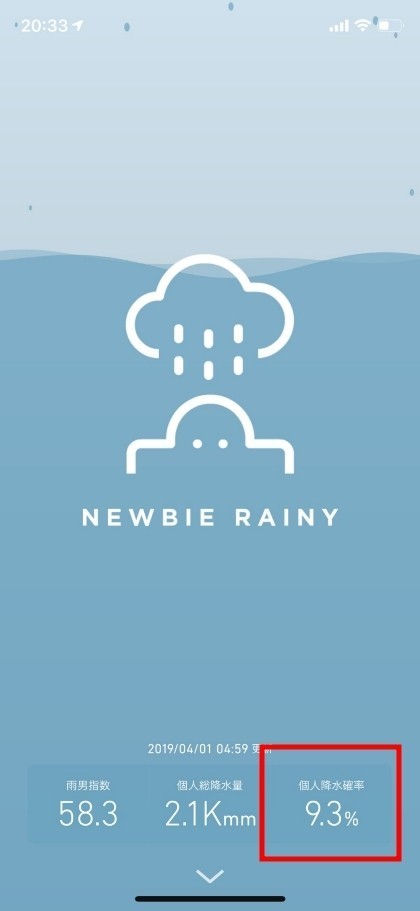 私はいま、個人降水確率「9.3%」で NEWBIE RAINY(雨降り新参者)でした。晴れ男でもないけど、雨男でもないという中途半端な感じですね。笑