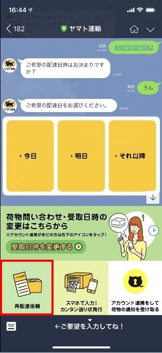 なんと「ヤマト運輸」の公式アカウントのトーク上で配達日確認/再配達依頼/受け取り場所変更など、様々な受取り手段を確認・変更することができるのです!(歓喜