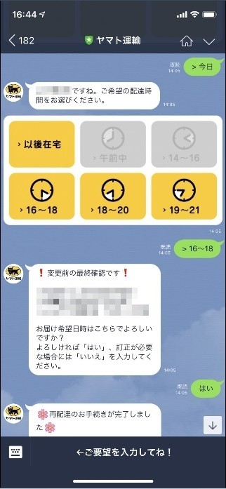 LINEだと、配達通知がプッシュで届くので見落とすこともなく、その場ですぐ変更できるので非常に便利ではないでしょうか。