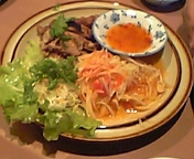 上から‘ソムタムセット’、‘ヤムウンセン’、‘パッドパックブン’お店は、なかなか怪しい感じでしたが、料理は、なかなかなもんです。ソムタムは青パパイヤのサラダですが、めっちゃ辛い。後から来る辛さに、ヤミツキ。