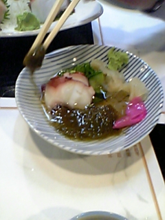 写真は、なぜか‘酢の物盛合わせ’。もずく、たこ酢、くらげ酢が盛り合わさってます。こんなんあるんやなぁ。
