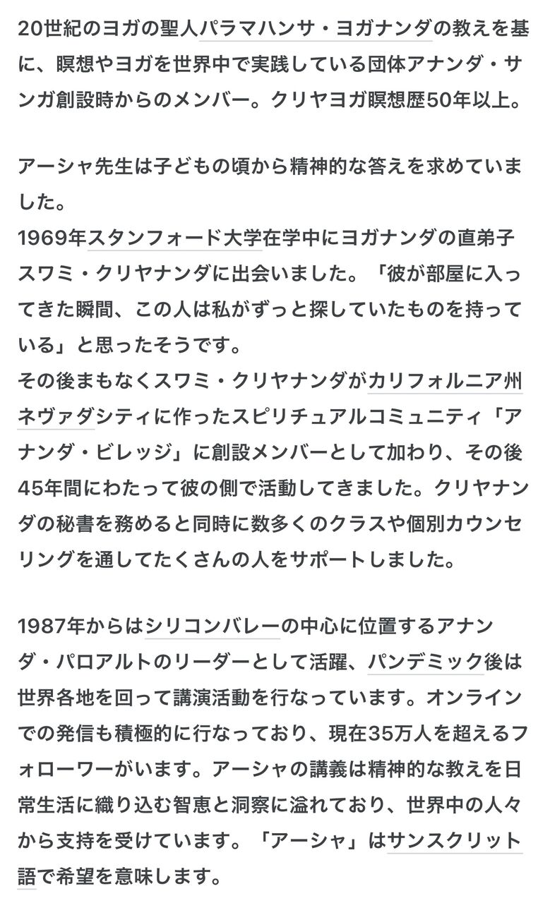 クリヤヨガの歴史的な霊的指導者のお一人であるヨガナンダの孫弟子であるアーシャ先生 と