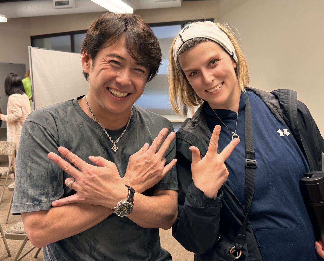 ↓ヴィクトリアからフェリーで来てくれた寺坂ティーチャー。二日連続、ありがとう!
