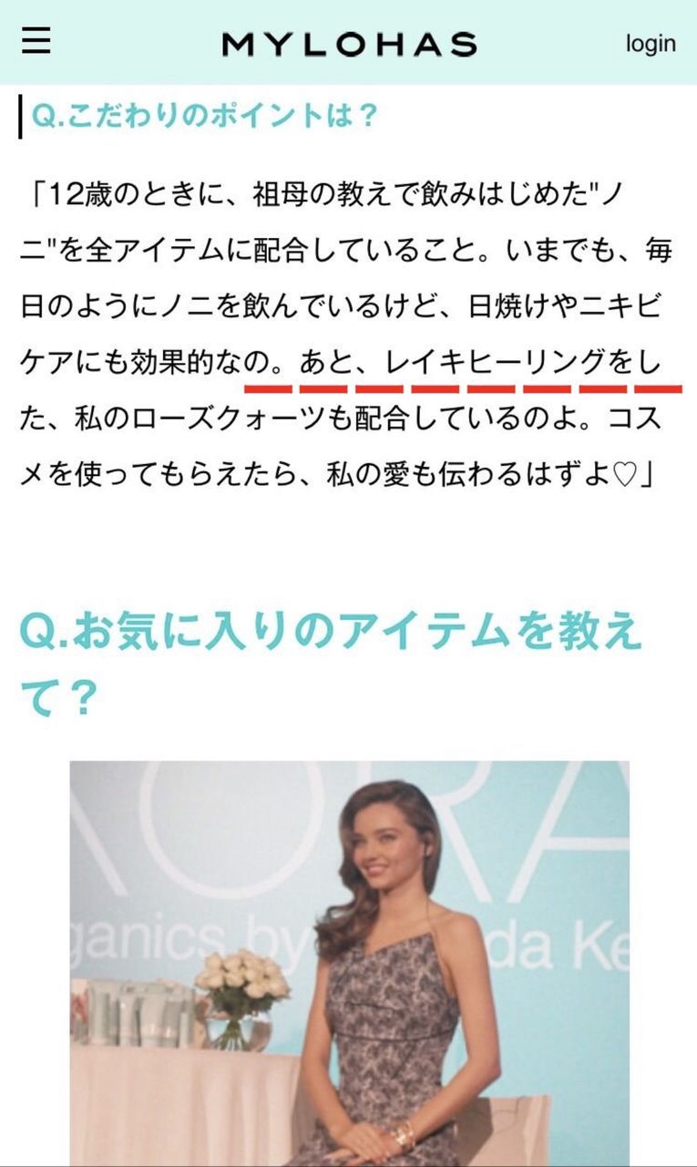↓レイキが大好きな ミランダ・カーさんはレイキエネルギーの入ったコスメ製品まで販売してます!