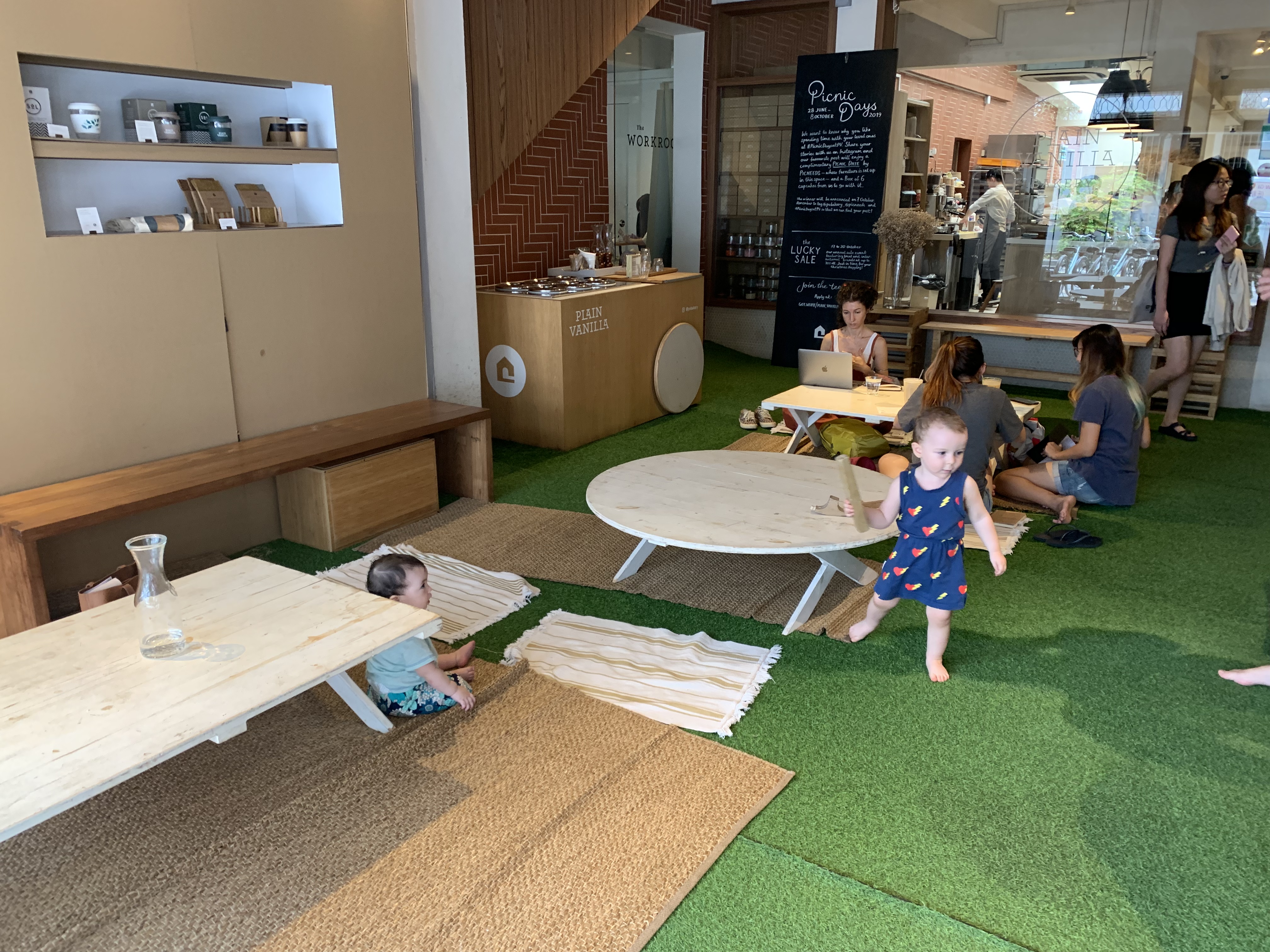 店内に入るとまずはキッズスペースになっていて、みんな裸足でゆっくりくつろいでいます。人工芝が引かれているのも嬉しいですよね😚踏み入れた瞬間、靴を脱いだほうがいいのか迷いますが、靴のままで大丈夫だそうです🙆♂️🙆♀️キッズスペースの奥に行くと入り口が二つあり、一つがオーダーのできるキャッシャーです。そして、もう一つがワークスペース!!