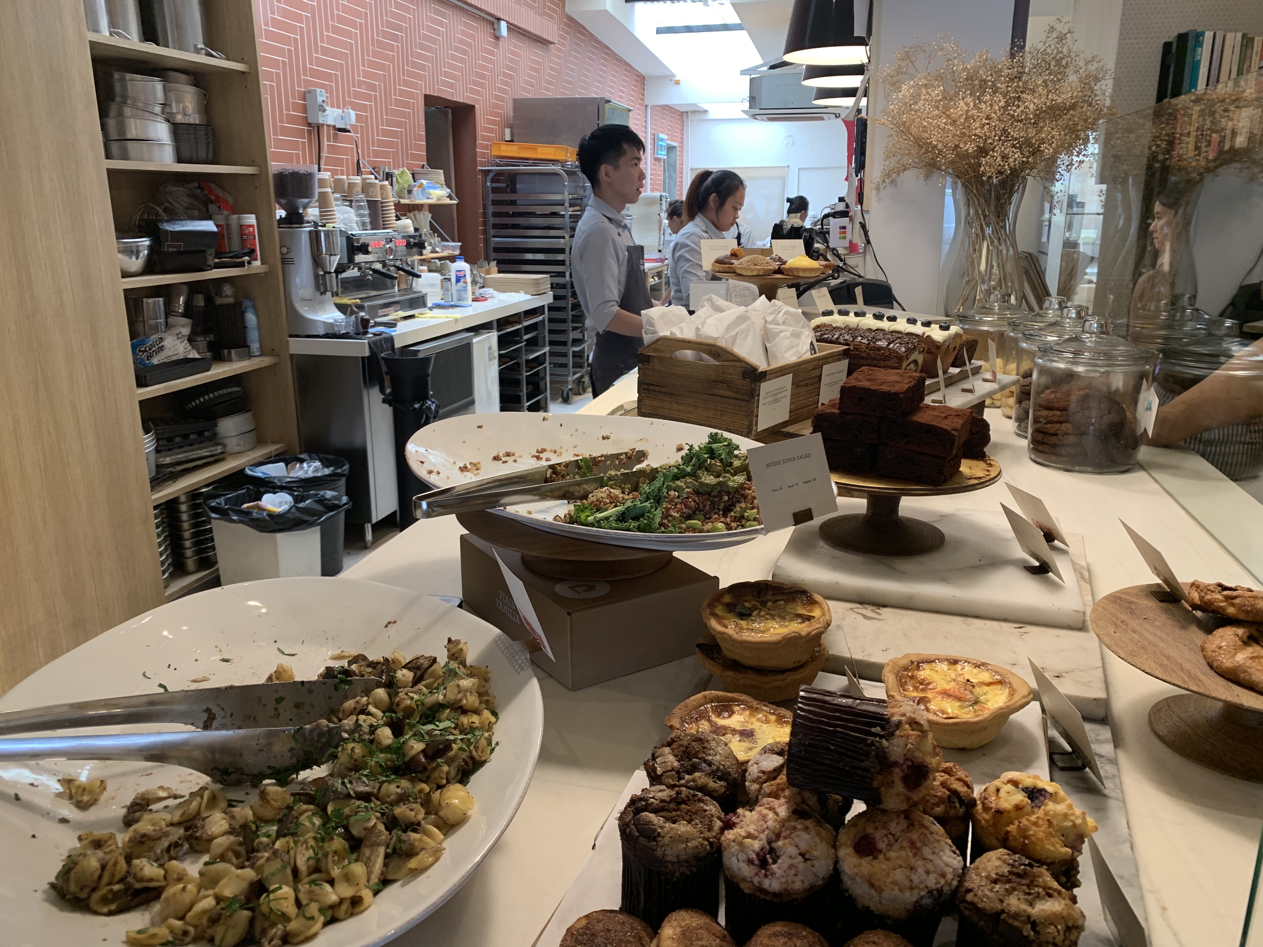 列の目の前には美味しそうなパイやマフィン、オーガニック系のサラダが並べられています。