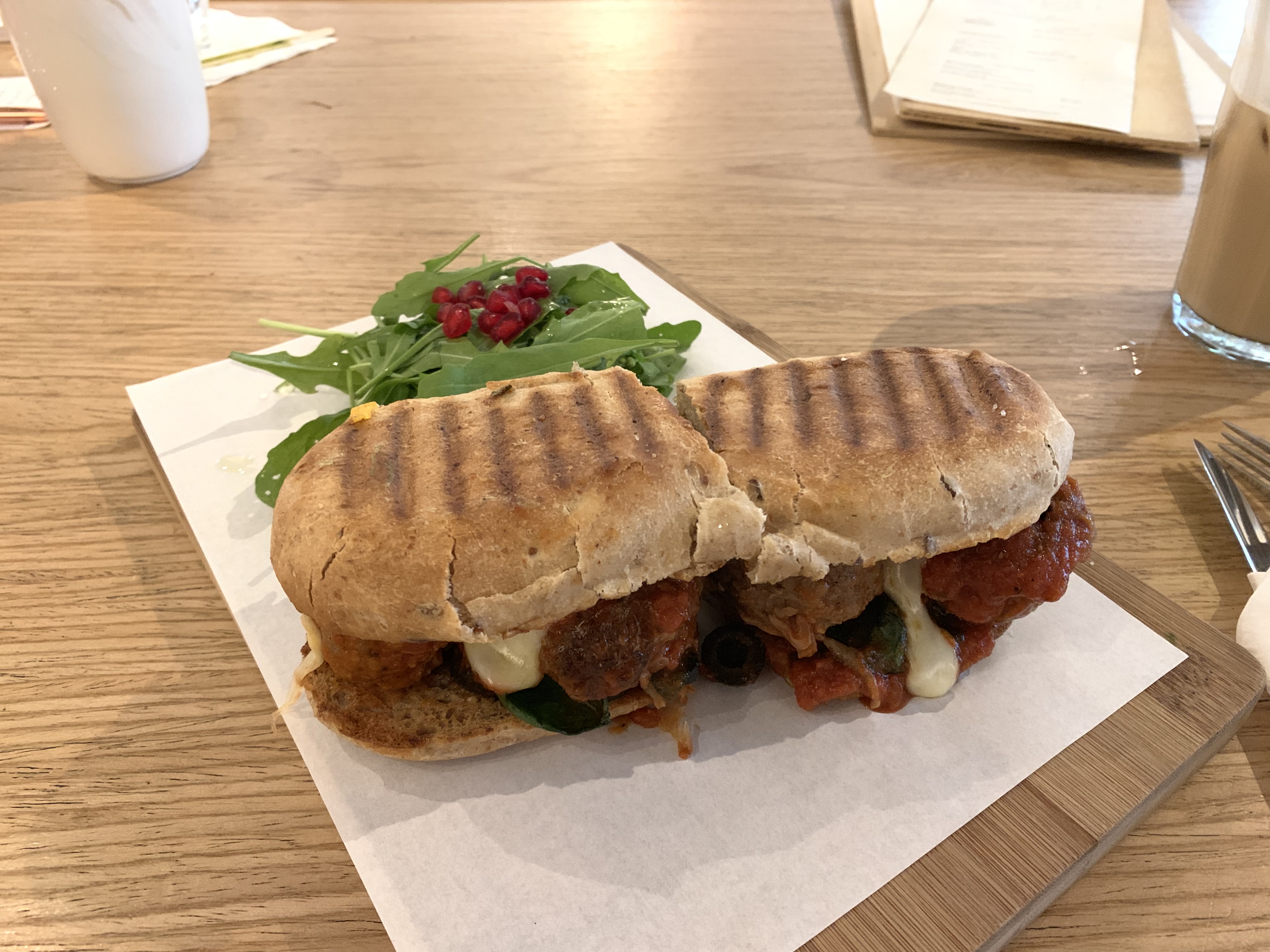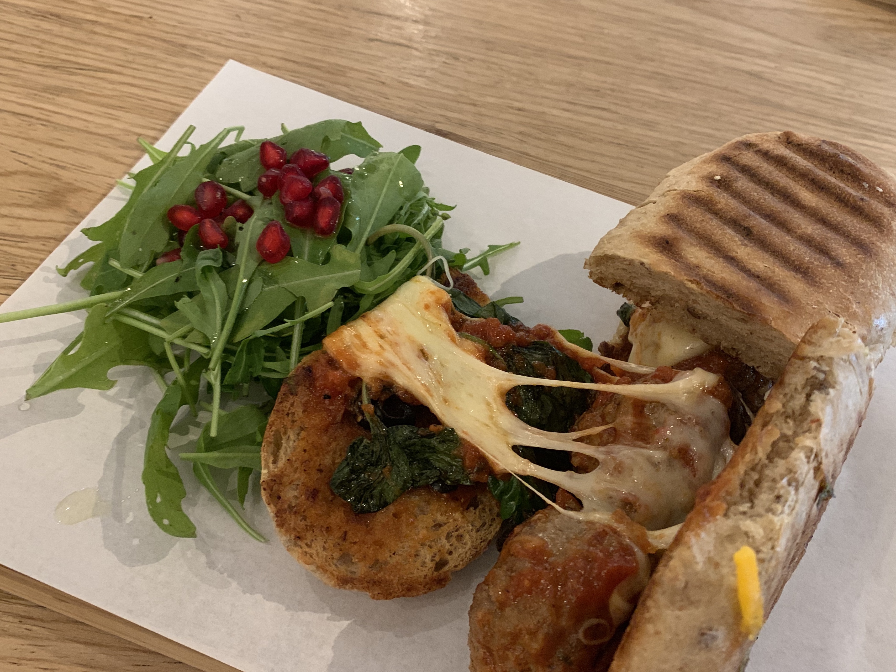 食べ物はサンドイッチミートボールチーズ$16.0を頼みました。中にごろっとしたミートボールととろとろなチーズが入っています。