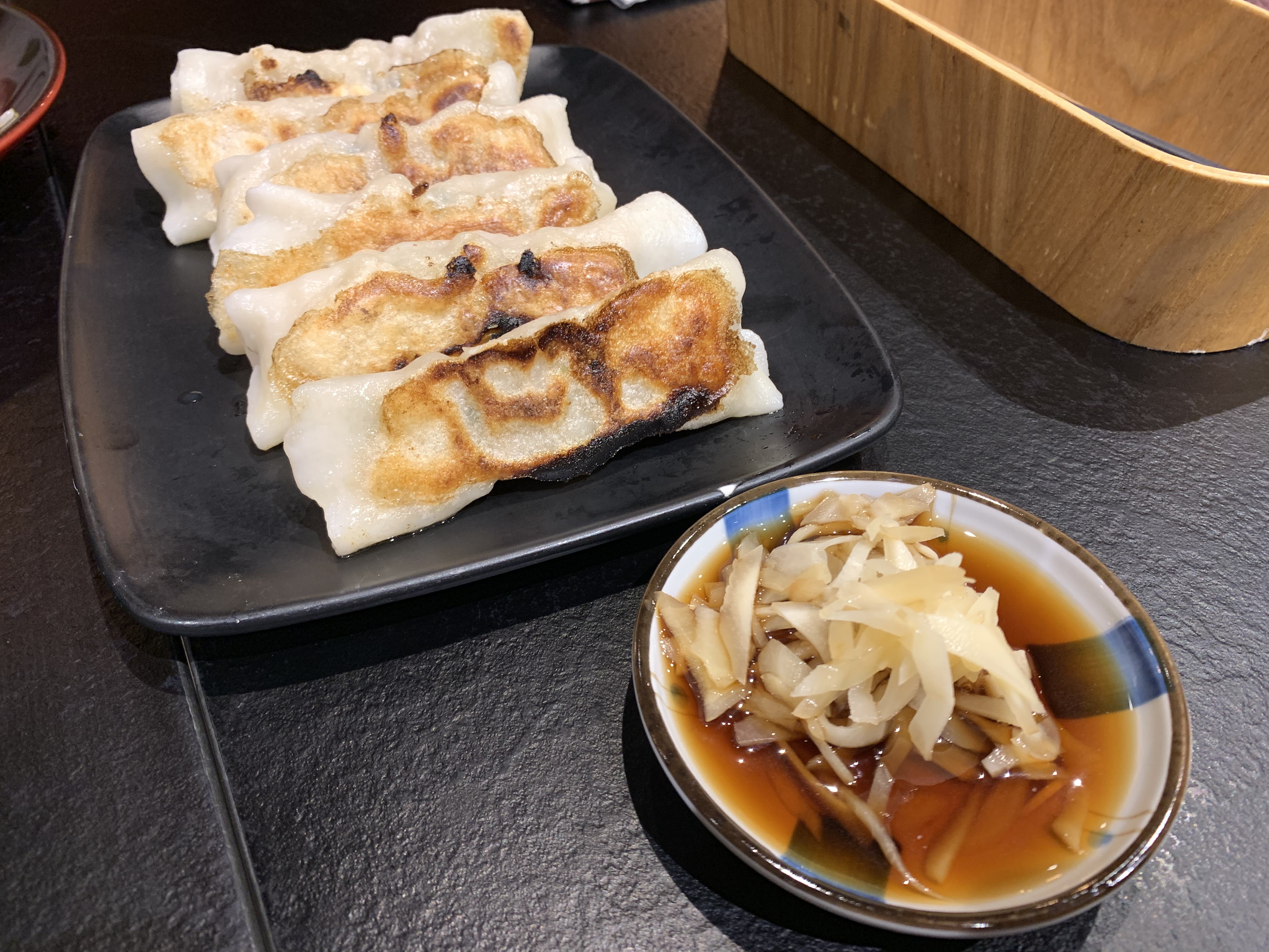 棒状餃子$8.40ディップ用の醤油には千切りされたガリが入れられていて、ちょっと不思議な味わいでしたが美味しいです。