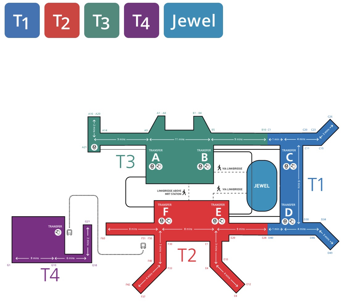 シンガポール国際空港チャンギエアポートに併設しているJewelはT1の真向かいに位置しており、T1出国フロアの横断歩道を渡ると入り口があります。T2とT3からは歩いて15分ほどで行くことができます。T4からは無料シャトルバスでT2に向かいから歩いて行けますよ😚