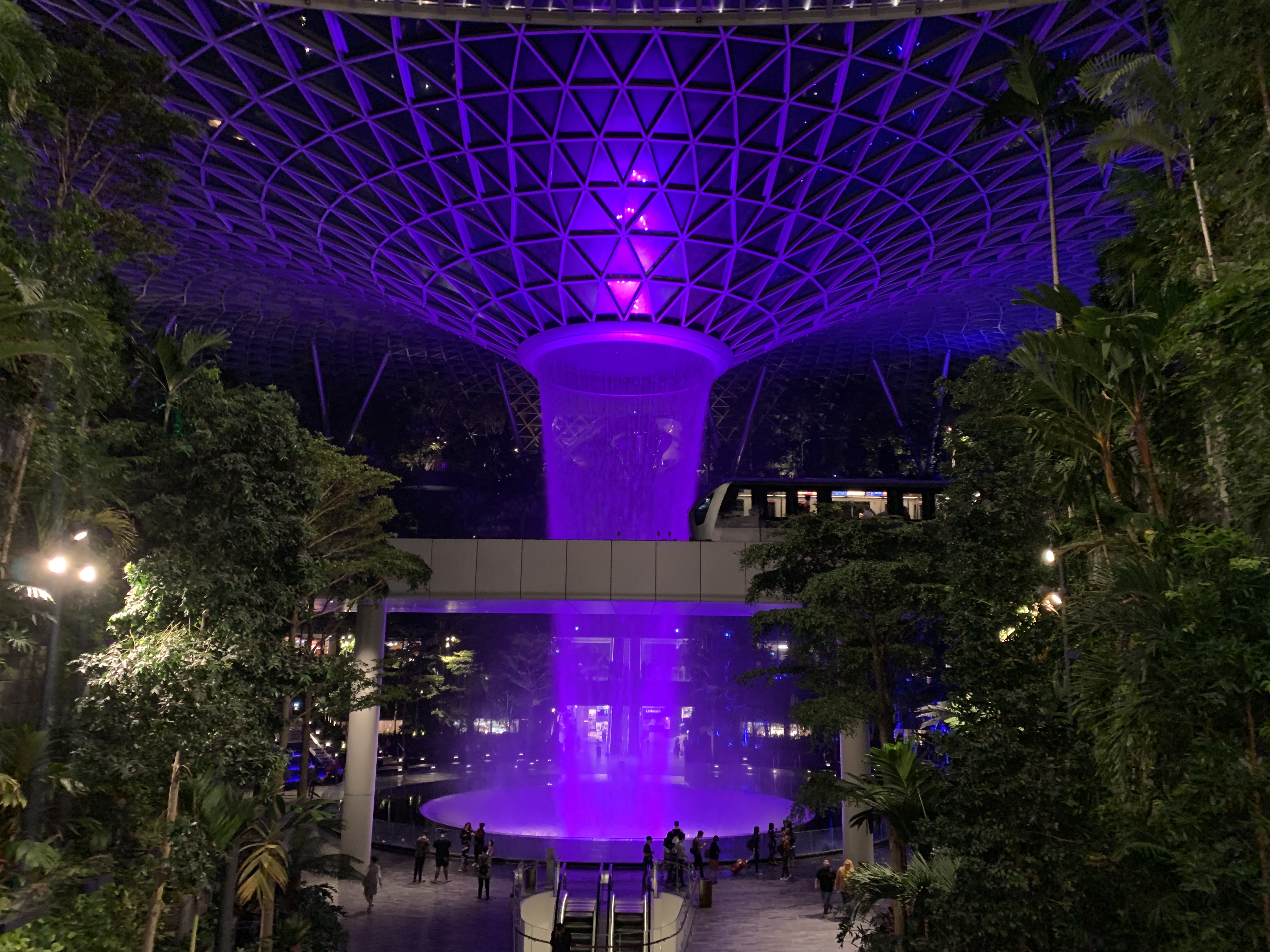 ジュエルにある目玉といえば、ドーム中央から流れている規格外の巨大な滝です!吹き抜けから流れ落ちる滝、レイン•ボーテックス(HSBC Rain Vortex)は高さがなんと40m‼️屋内では世界一のスケールだそうです😳綺麗にライトアップされています。いろんな色に変わっていきすごく綺麗でした。