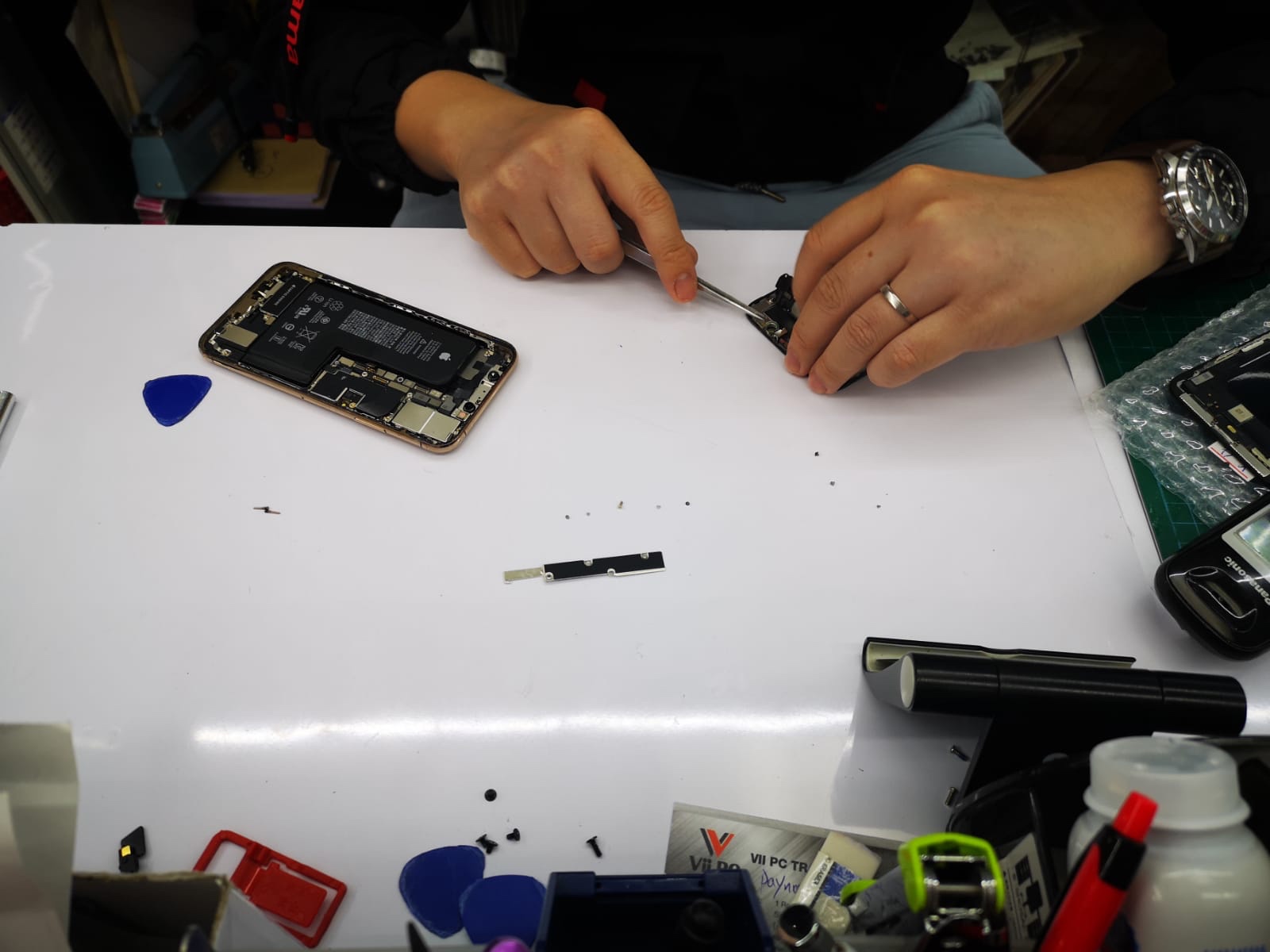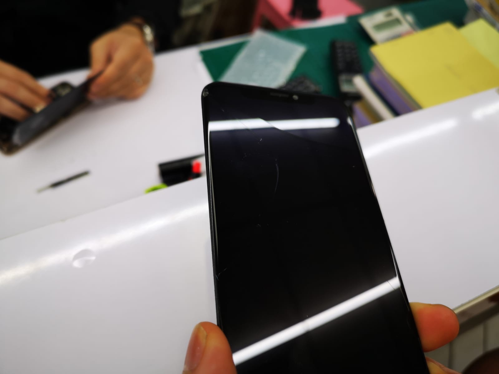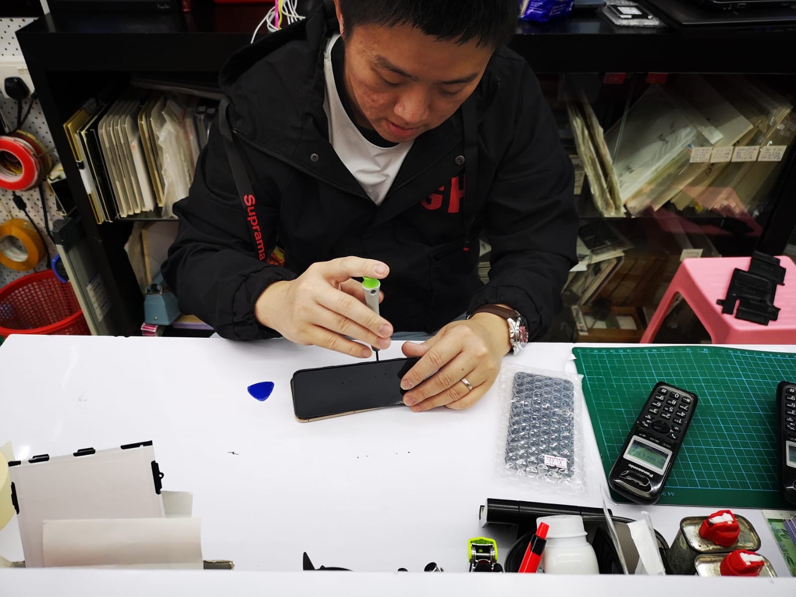 Jimmyとの馴染みはないので、まずは値段交渉。なんやかんや話して、最終的にガラス製のプロテクトのスクリーンんも込みで$100まで落としてくれました😚圧倒的感謝👍そして修理スタートです。