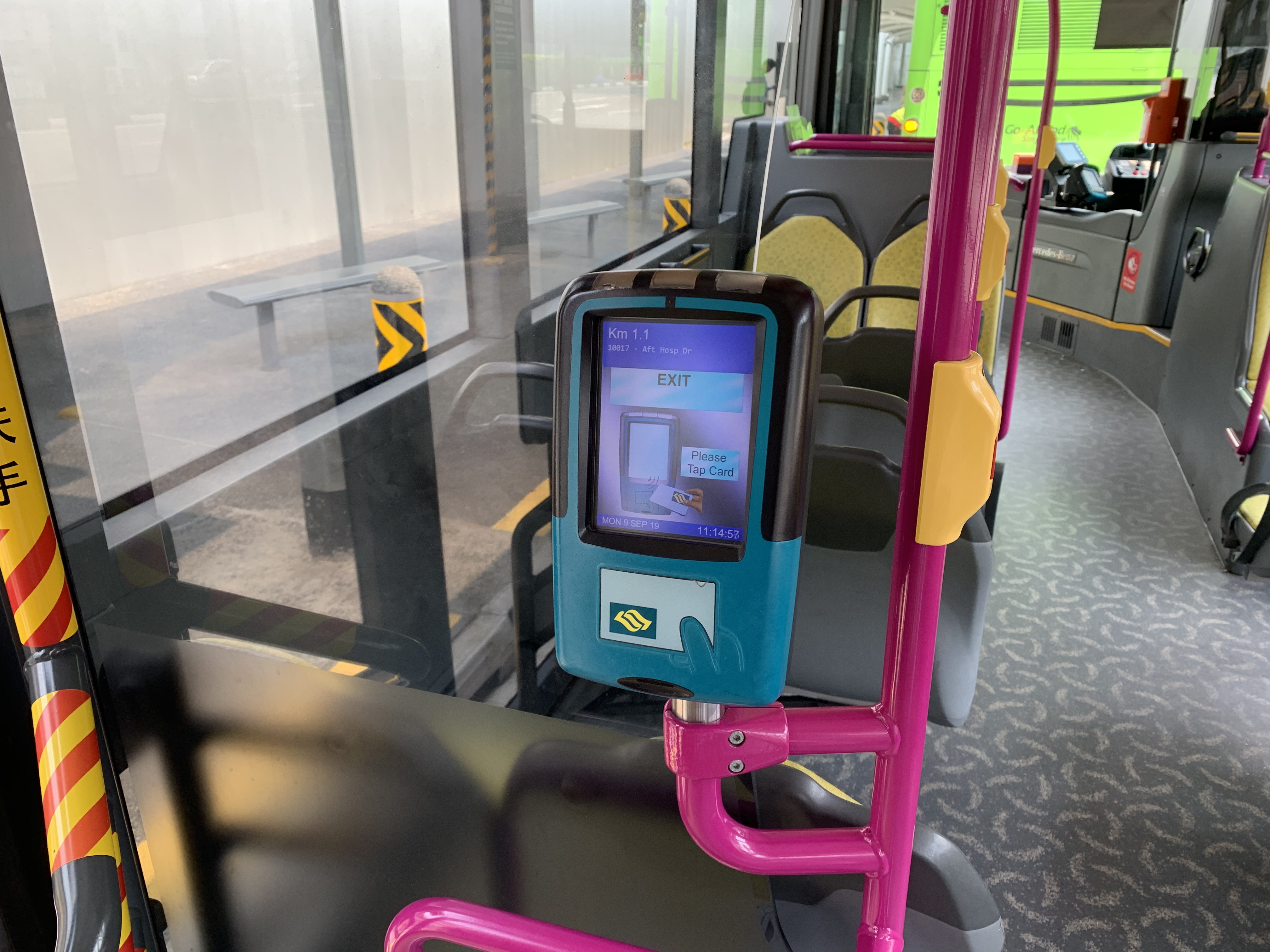 前方、後方ドアにはこのような機会が取り付けられていて、ez-Link(日本でいうSuicaのような)をタップすることで料金の支払いができます。現金で支払おうとすると値段が1.5〜2倍くらいかかります。そしてバス内に両替機が付いておらず、運転手からお釣りをもらうこともできません。