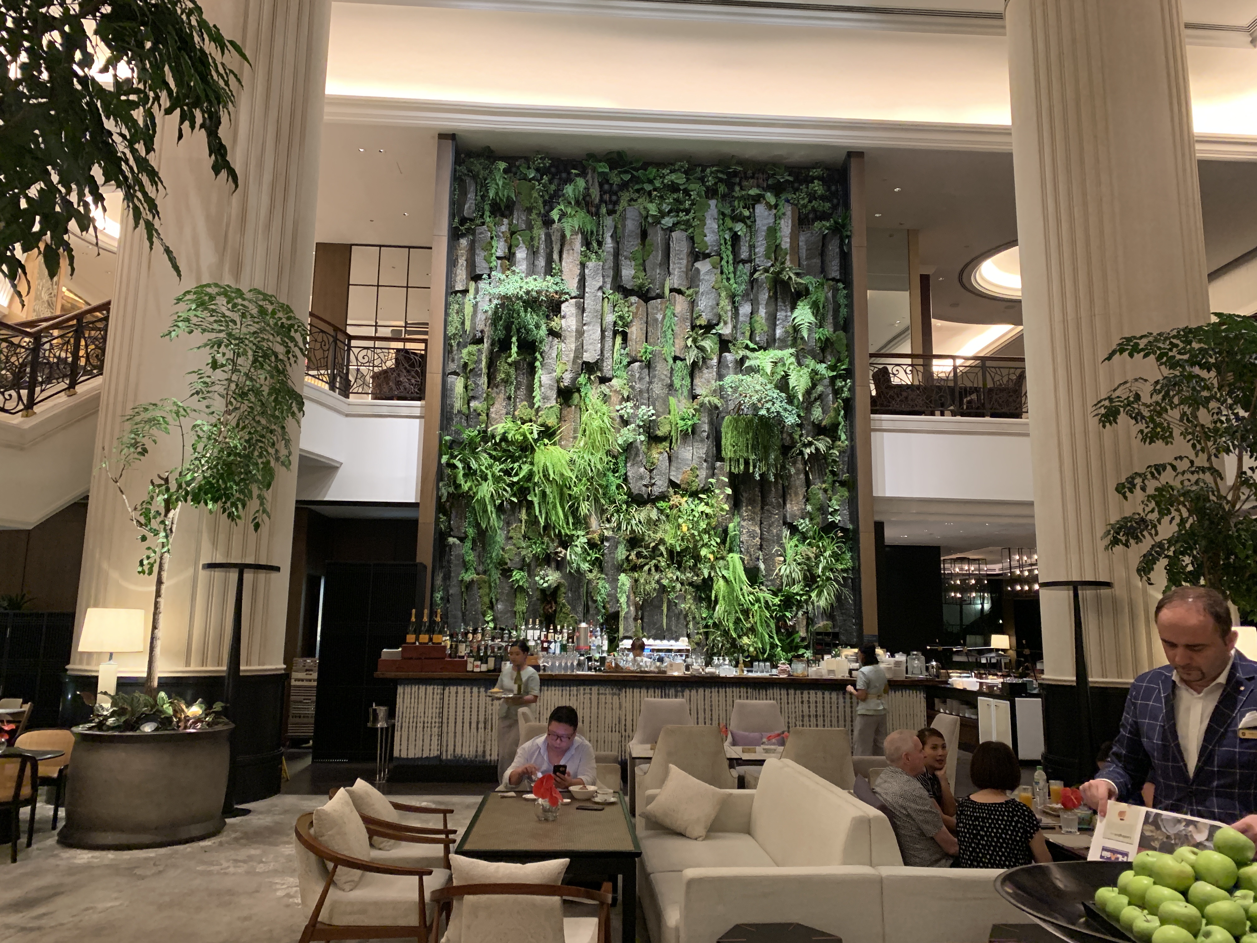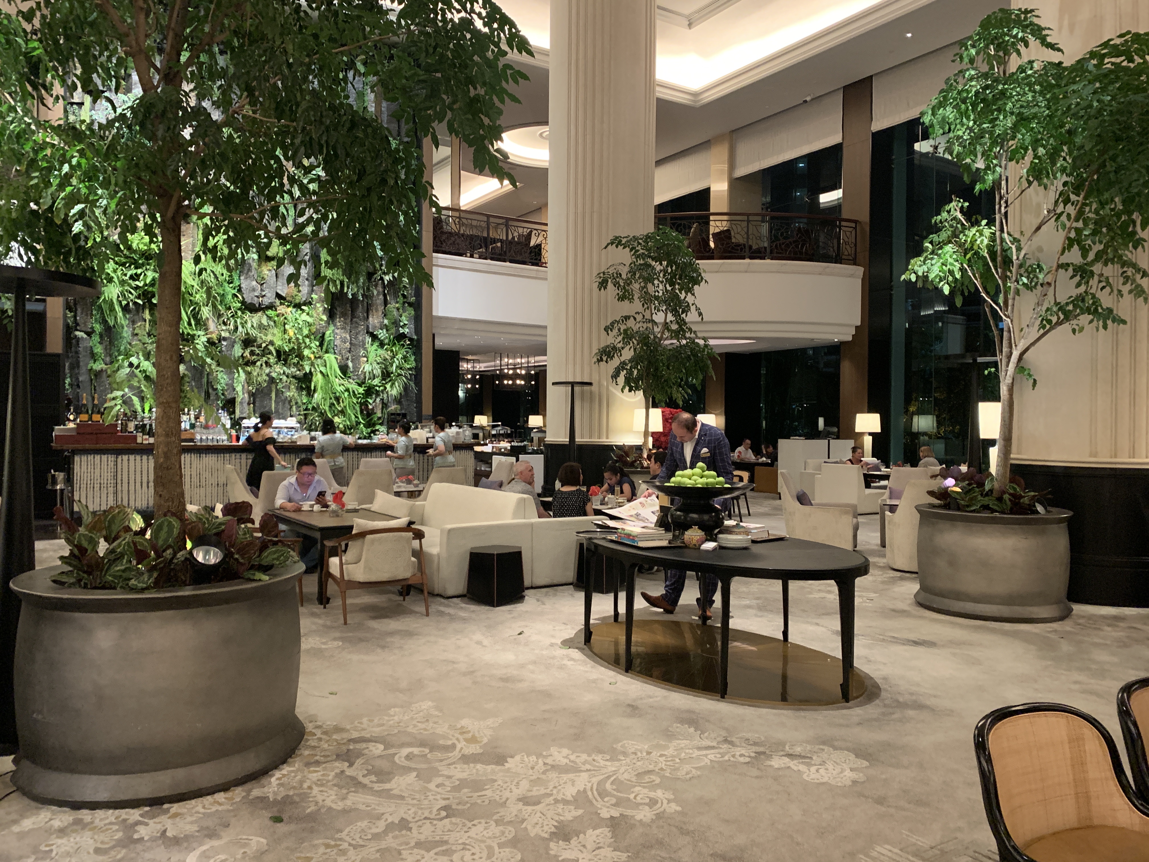 ホテルのメイン玄関には滝と観葉植物のディスプレイがあり、ロビーには踏み心地のいい絨毯が敷き詰められています。