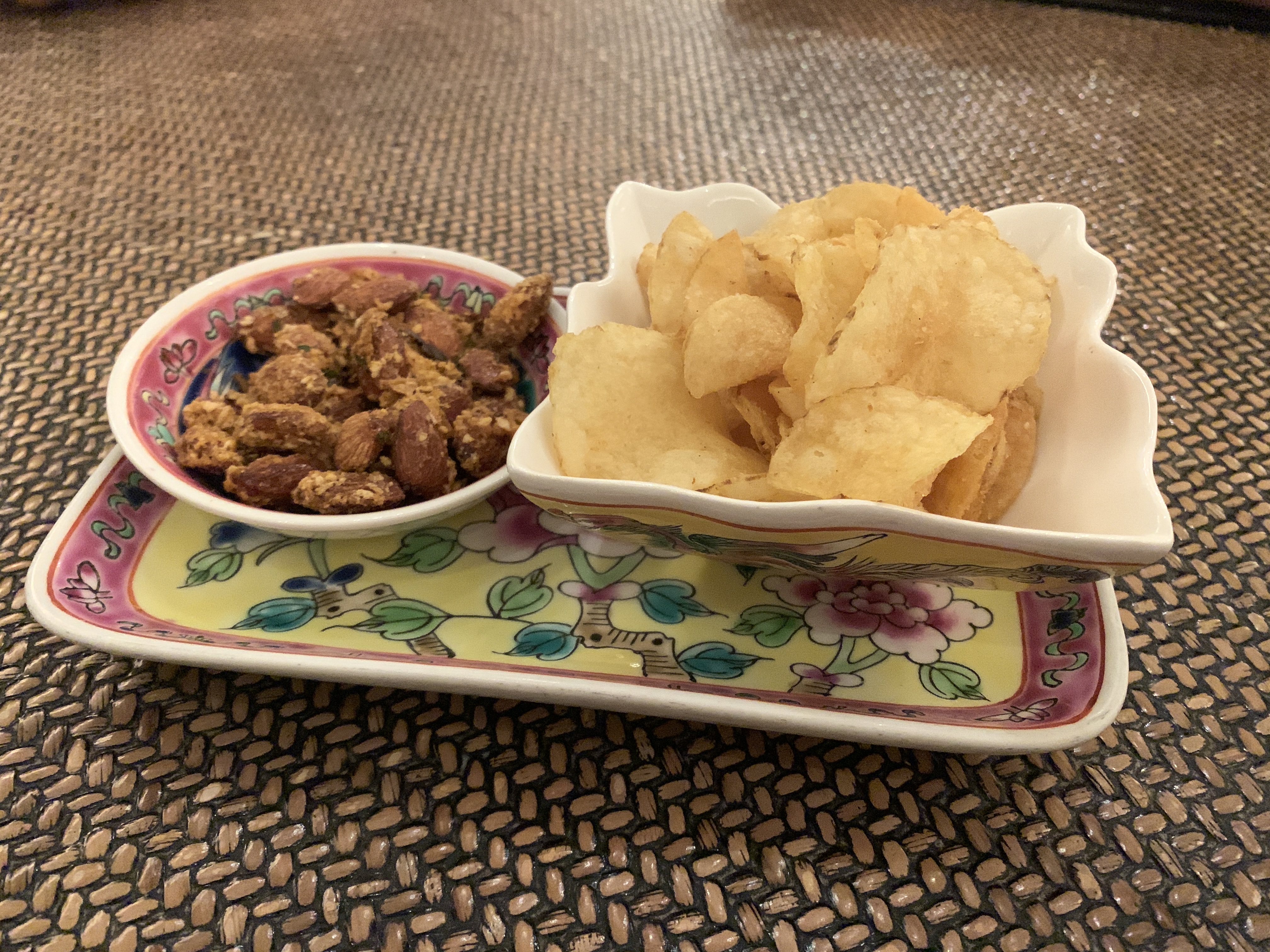 プラナカンのトレー、小鉢に乗っておます。もはや上に乗っているチップス&ナッツよりも器のほうが値が張るといった状況。