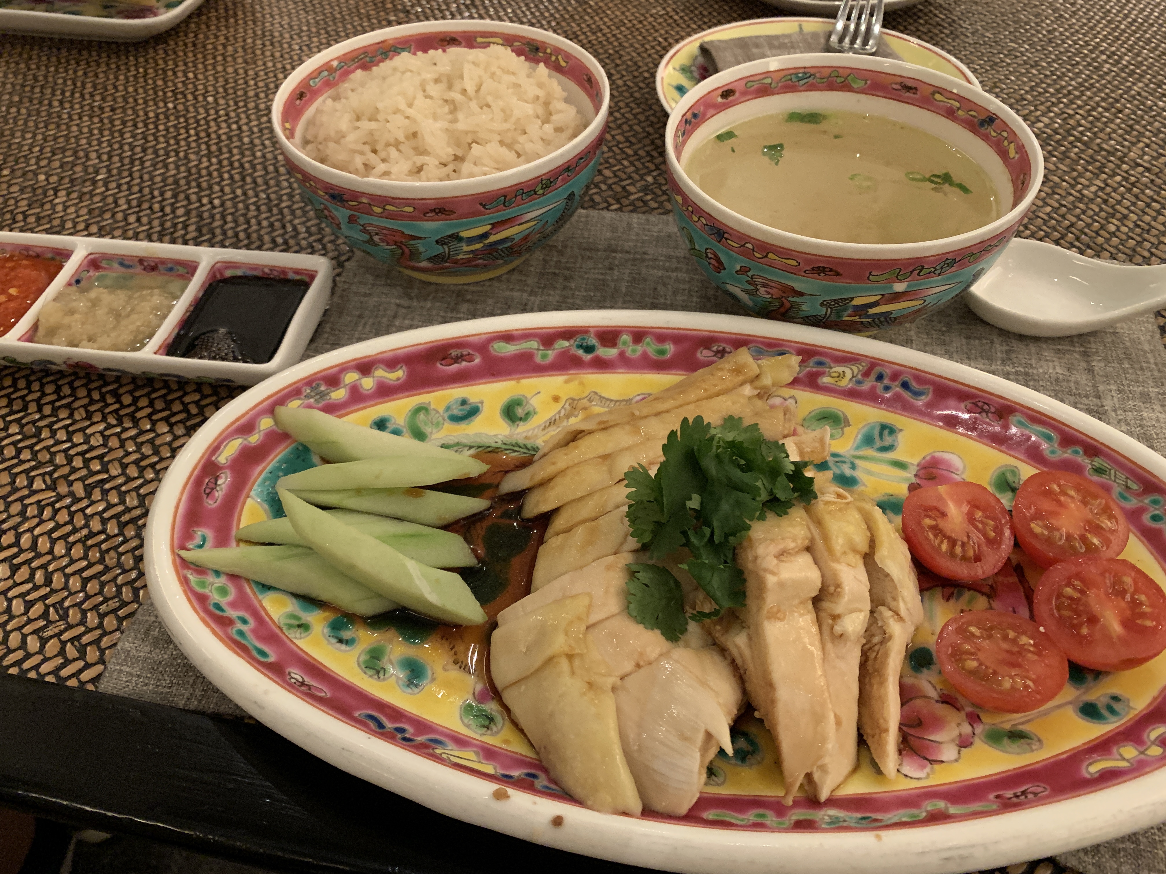 そして海南鶏飯チキンライス$22.0の到着。小鉢もお皿も全てプラナカン柄です。すごい‼️これぞまさにシンガポールといった感じ。こちらの味付けも脂っこくなく、さっぱりと食べれるチキンライスでペロリといただけました😋