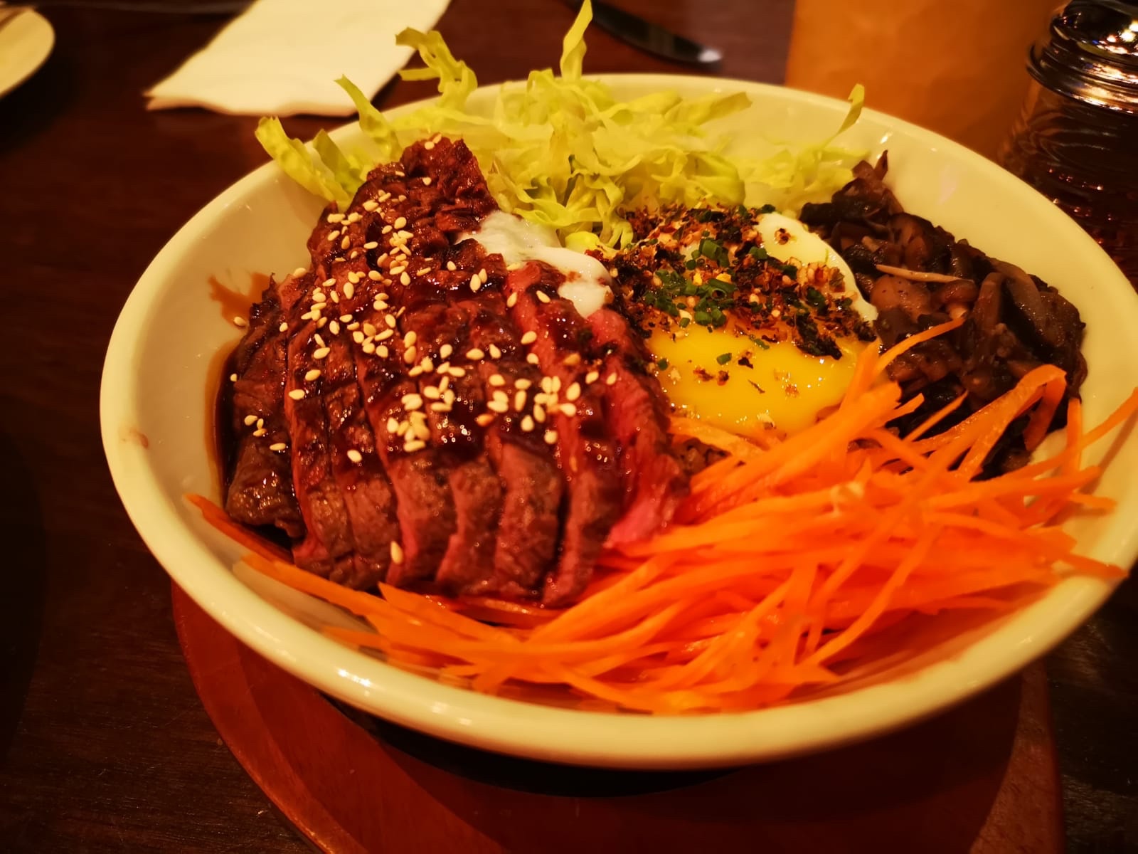 ミディアムレアに焼かれたビーフステーキがどかんと乗っています‼️キャベツ、にんじん、椎茸の煮物が添えられていて、その上にトリフがかけられています。ソースは甘辛テイストですごく食べやすかったです😋