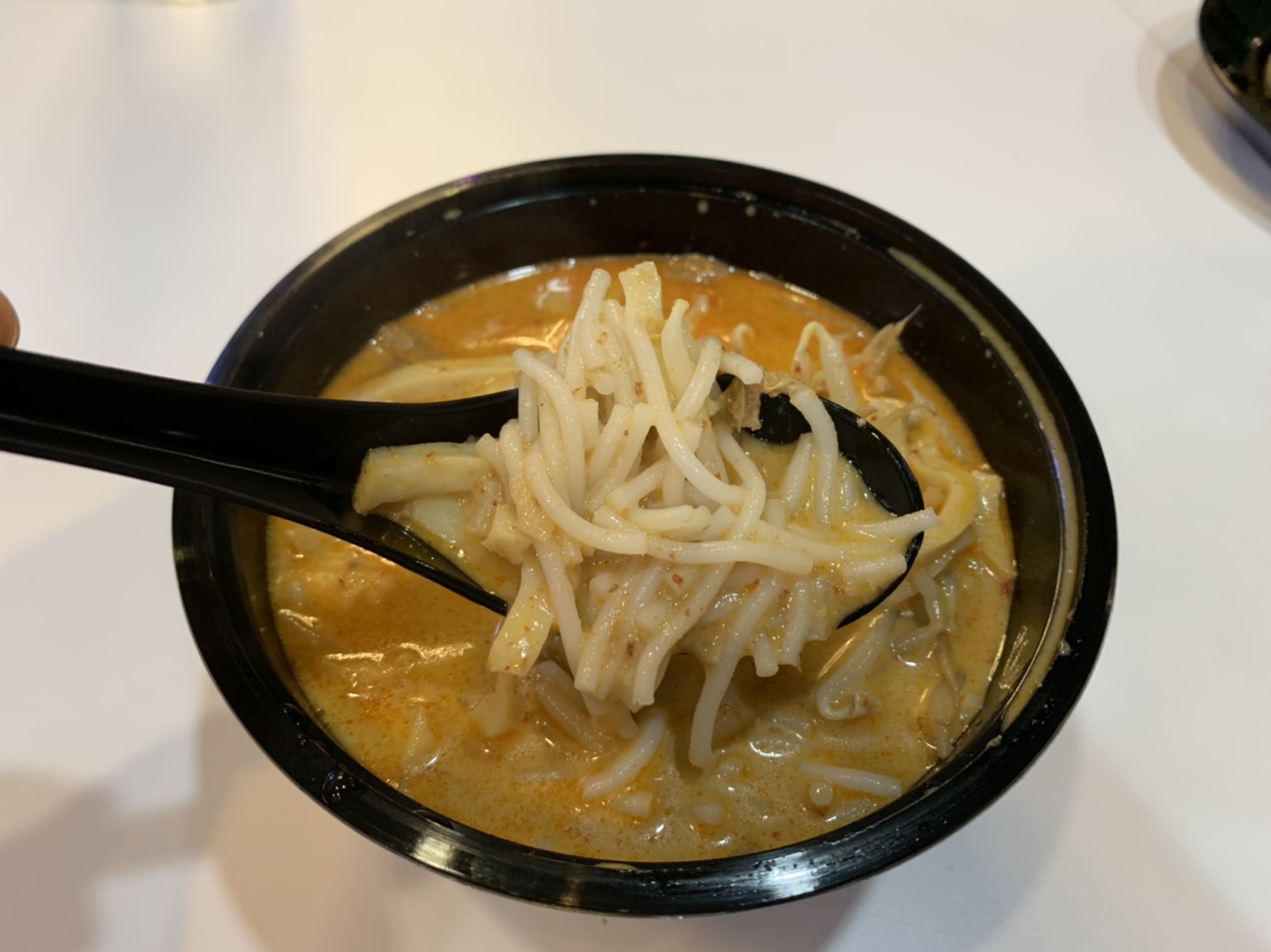 今回はラクサMサイズを頼みました。店舗にお箸は用意されておらず、短い麺とスープを一緒にレンゲでいただきます。うん‼️美味しい。海鮮出汁というよりかは貝の味が強く出ていますが臭み等は感じないです。貝の風味の次にココナッツ、そして香辛料という順に味を楽しむことができました。