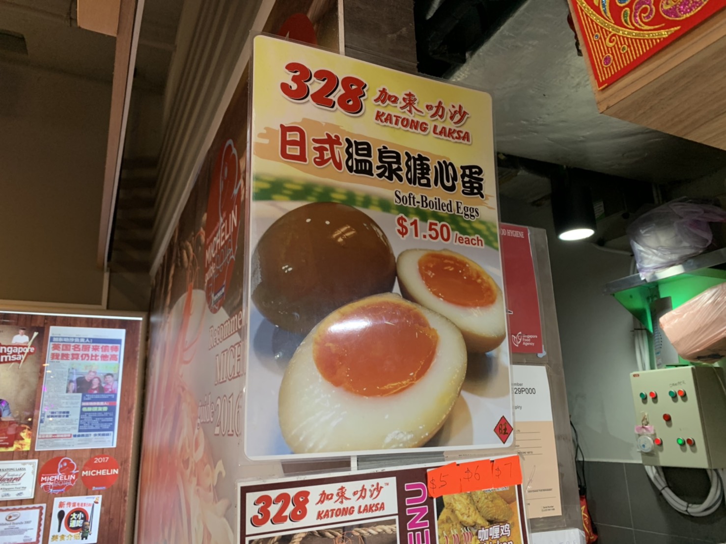 それ以外には煮卵が1つ$1.5でした。美味しそうだったので思わず追加‼️アロエジュース、ライムジュースなどの飲み物も売っていますが、ラクサはそこそこ辛いので水を頼むのがオススメです👍