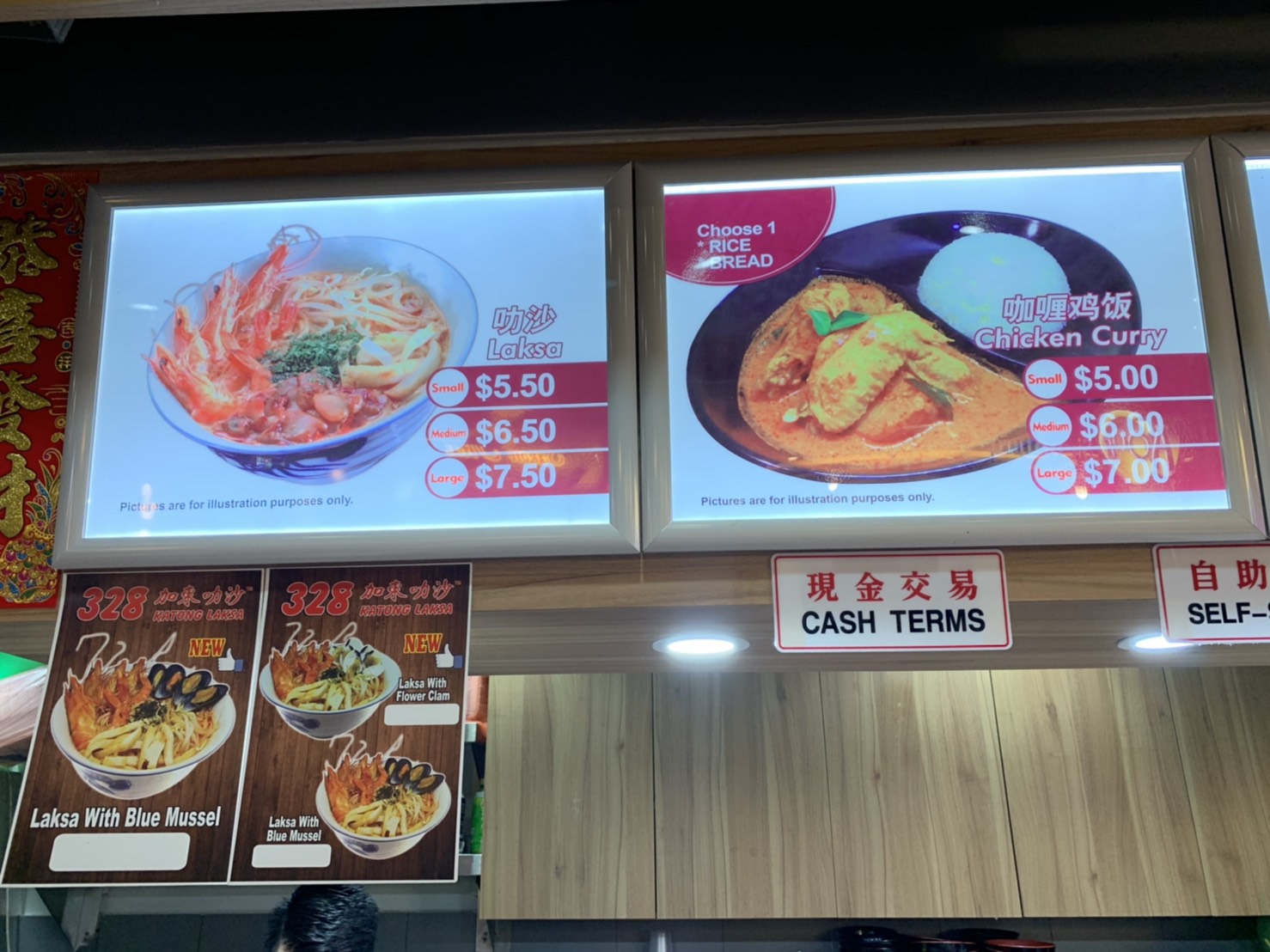 お店で用意されているメニューは至ってシンプルです。ラクサS$5.5 M$6.5 L$7.5となっています。それ以外はチキンカレーもあります。確かにラクサのスープとシンガポールのローカルのカレーの味は多少似ているものがあるかもしれません。