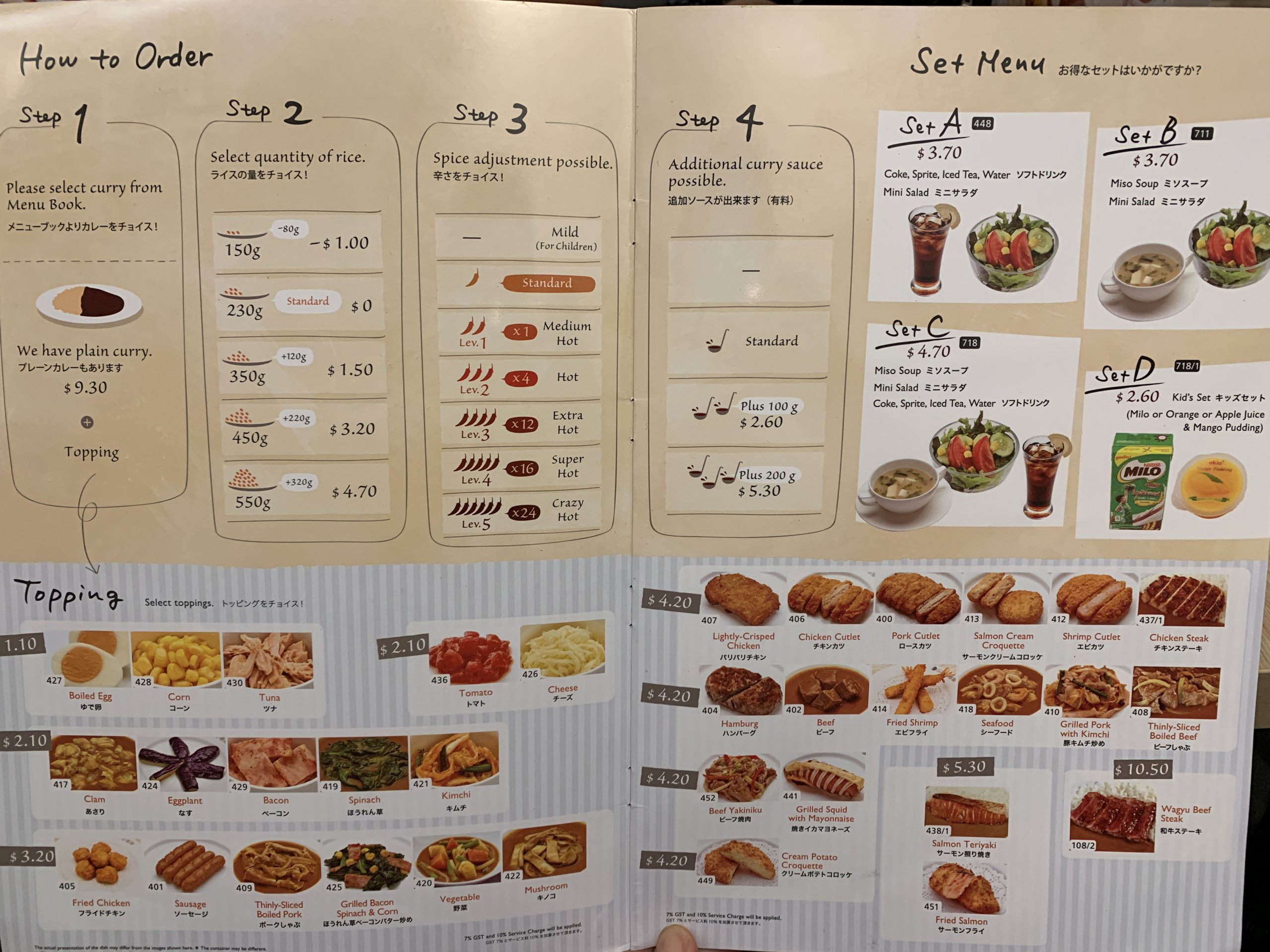 日本のココイチ同様に、ご飯の量、辛さ、ルーの量などが選べるようになっています。トッピングもそれぞれ用意されていて値段により選べるものが変わってきます。