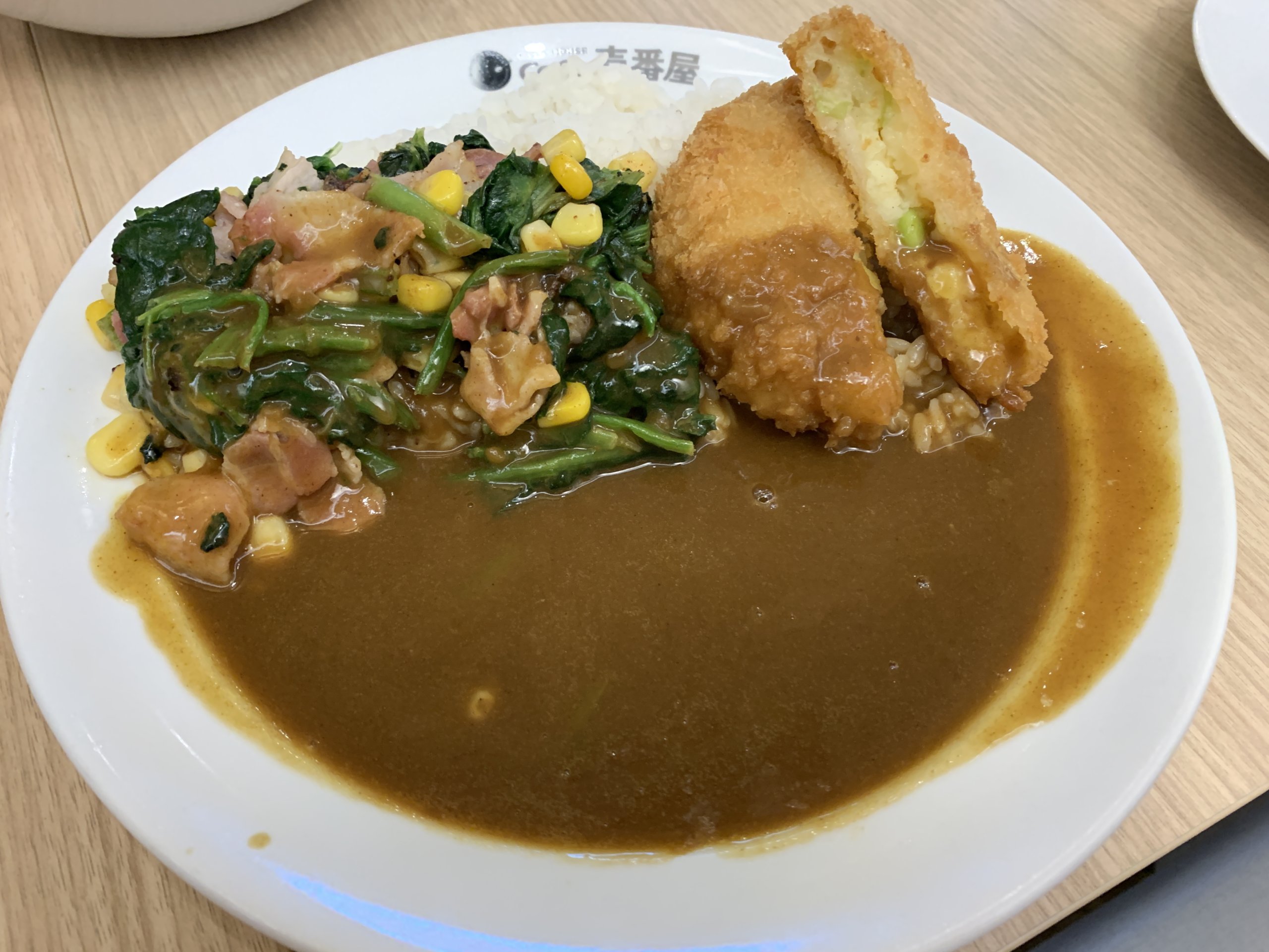 ほうれん草ベーコンバターカレー$12.5にしました。バターがいい具合に染みていてご飯がますます美味しく食べれます。クリームポテトコロッケ$4.2をトッピングでオーダー‼️