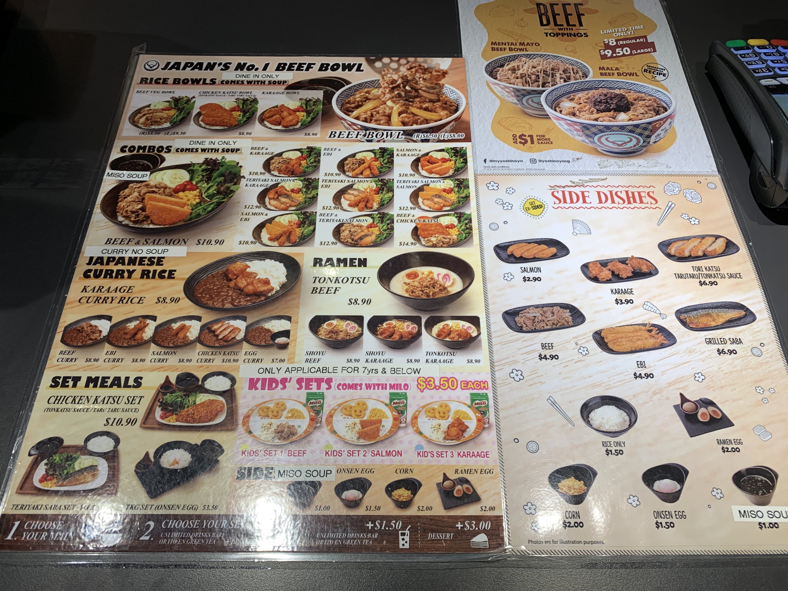 メニューはやはり日本のとは異なっている様に感じます。牛を食べない人が多いシンガポールならではなのでしょうか?日本ナンバー1メニューということで牛丼も用意されていますが、サラダコンボ、カレー、ラーメンなども豊富に用意されています。
