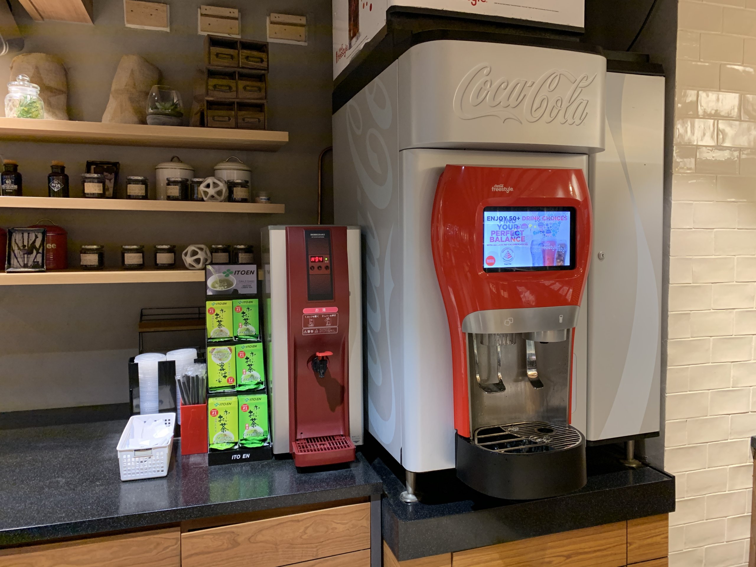 その隣にはドリンクバーも設置されています😳そして、カフェの様なおしゃれなテーブルで日本味の牛丼をいただきます‼️